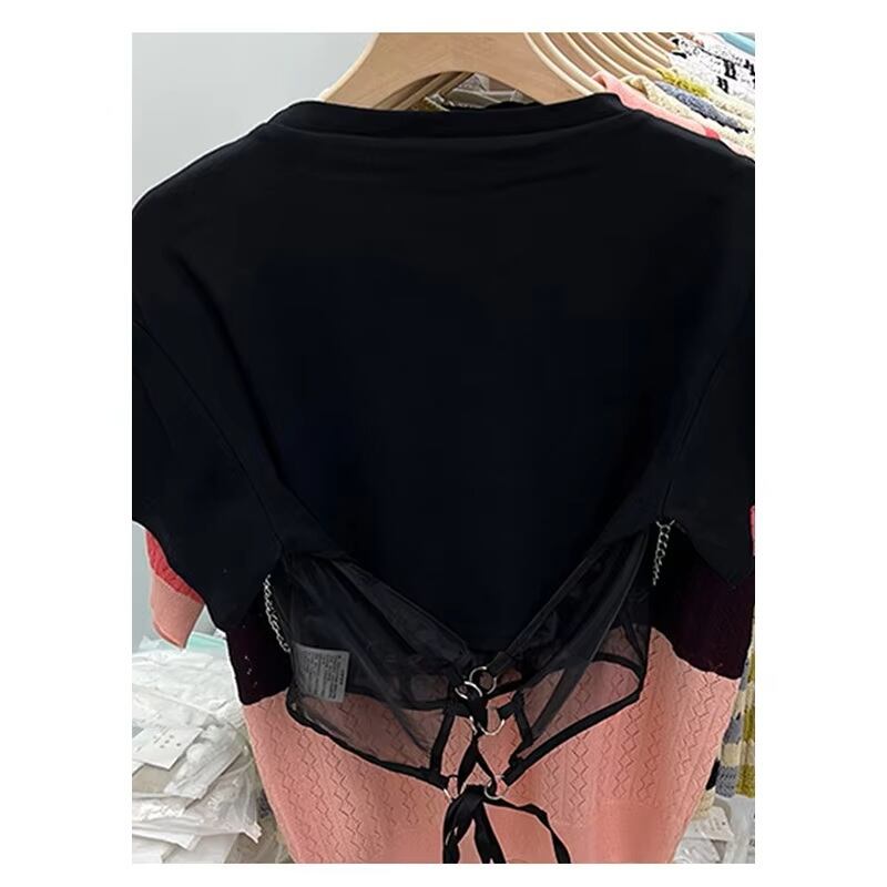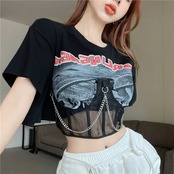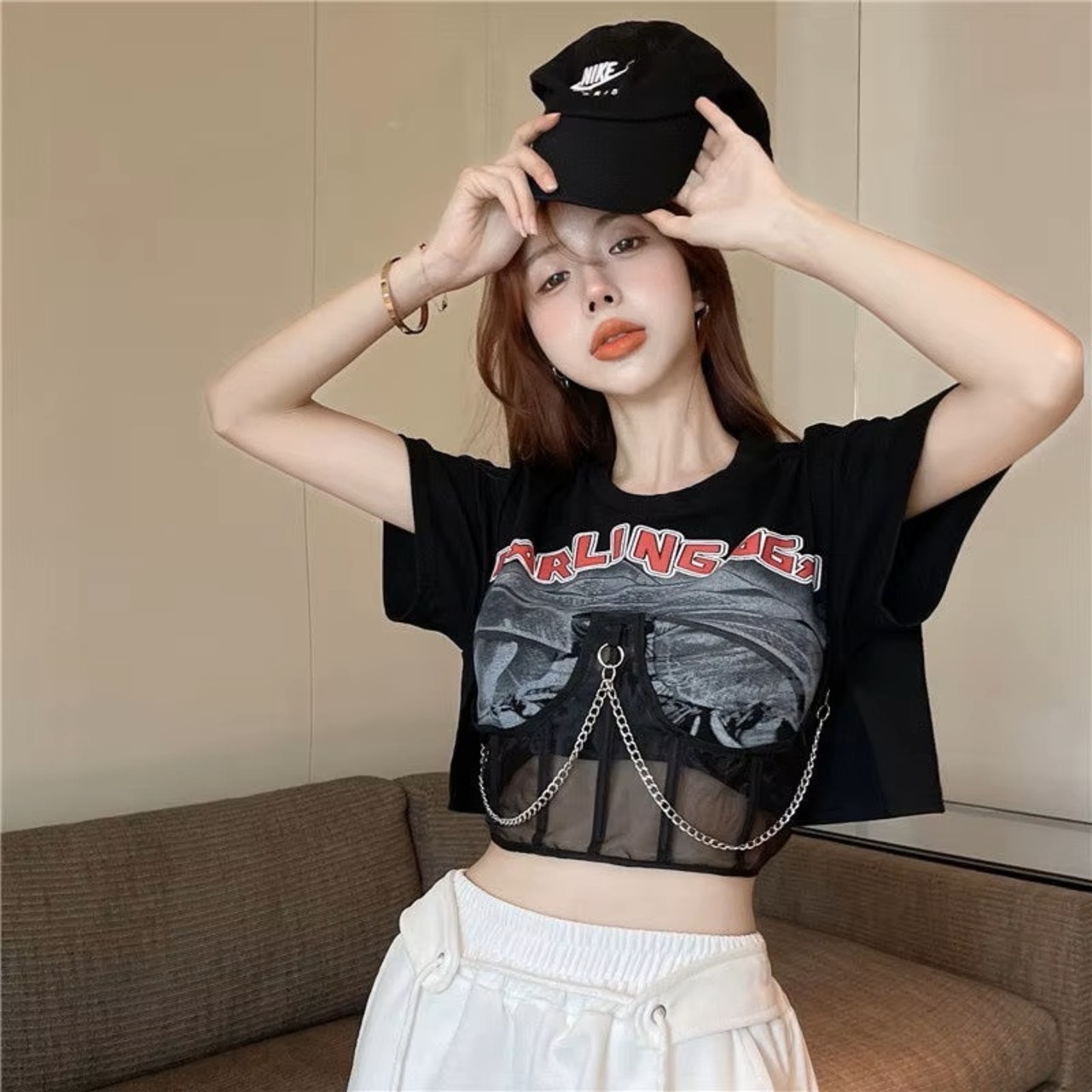 半袖 Tシャツ コルセット ロゴ トップス ショート丈 チェーン 韓国 ダンス 衣装 ストリート系 Y2Kファッション K-POP HIPHOP ギャル レディース 9T-12