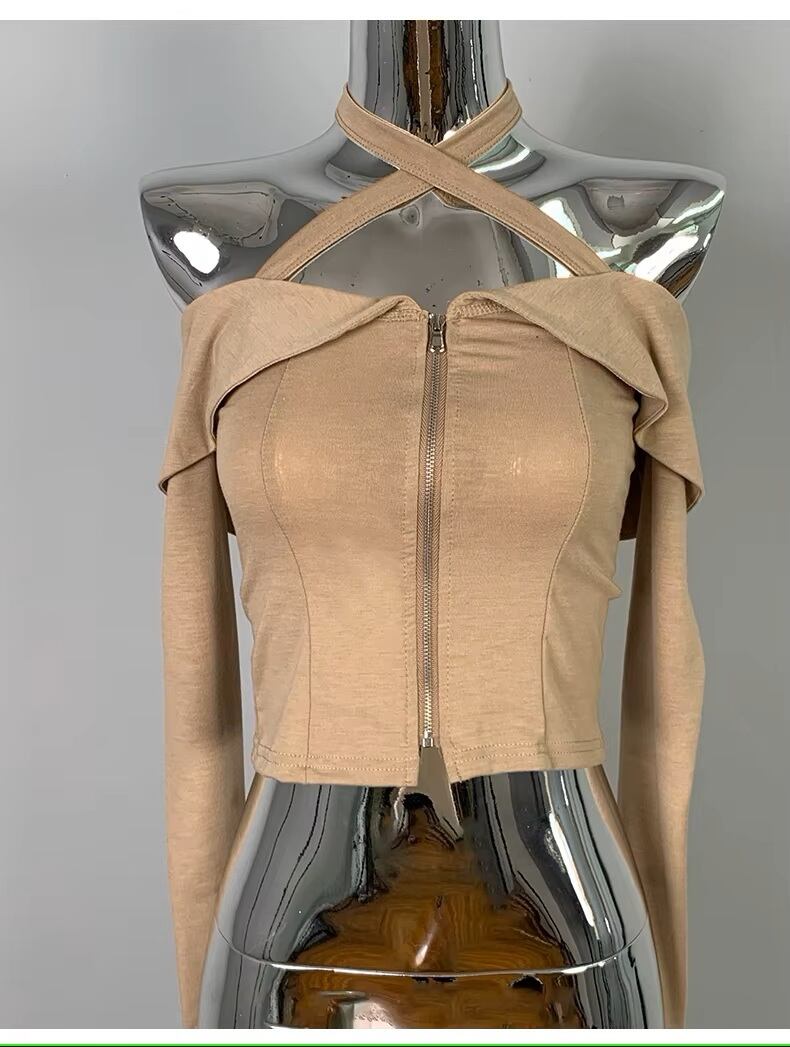 オフショル トップス ロンT Tシャツ ホルターネック ジップ 長袖 韓国 ストリート系 ギャル ダンス 衣装 K-POP HIPHOP レディース 9T-14