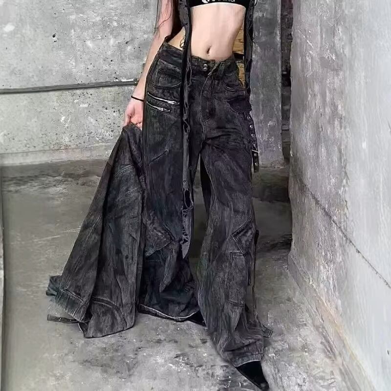 カーゴ デニム パンツ ジーンズ ポケット ストラップ 韓国 ストリート系 ダンス 衣装 グランジ K-POP HIPHOP レディース 9J-9
