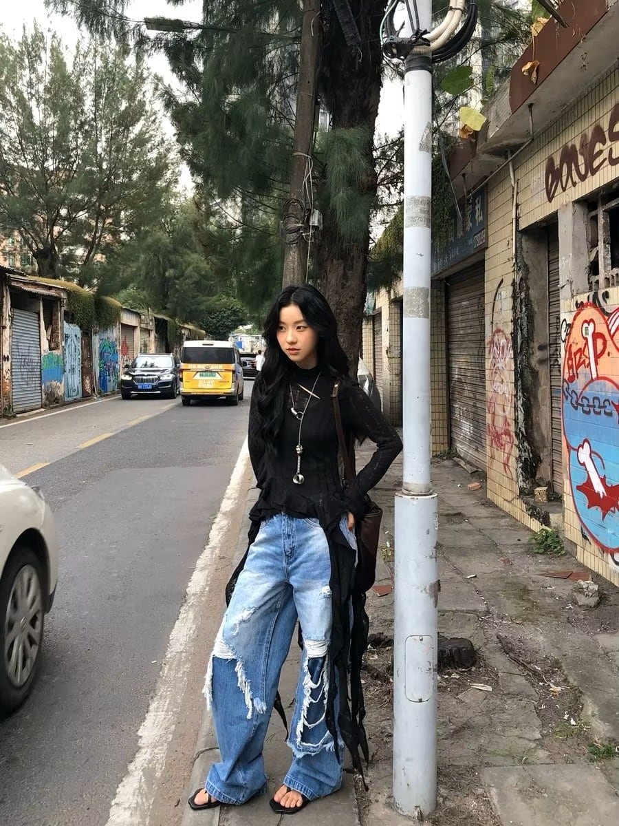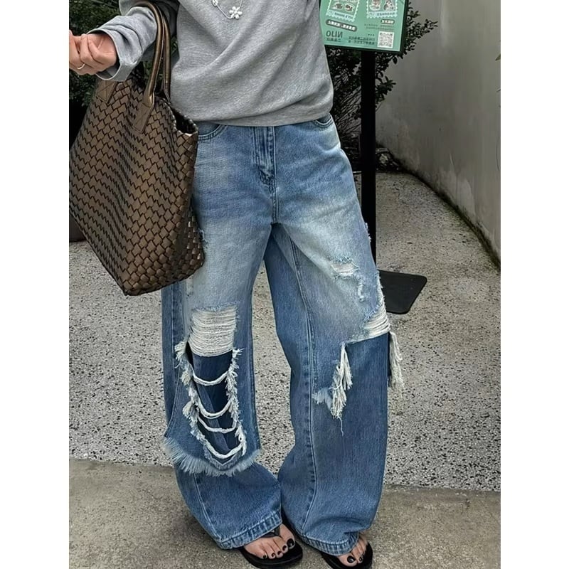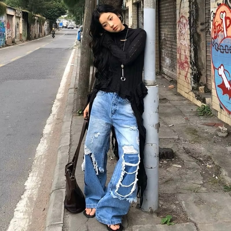 リメイク風 デニム パンツ ジーンズ ドッキング ダメージ 韓国 ストリート系 ダンス 衣装 K-POP HIPHOP グランジ レディース 9J-20