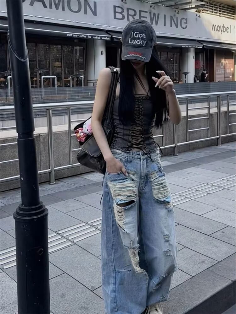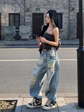 クラッシュ ダメージ デニム パンツ ジーンズ 韓国 ストリート系 ダンス 衣装 K-POP HIPHOP グランジ 大人 レディース ファッション 9J-27