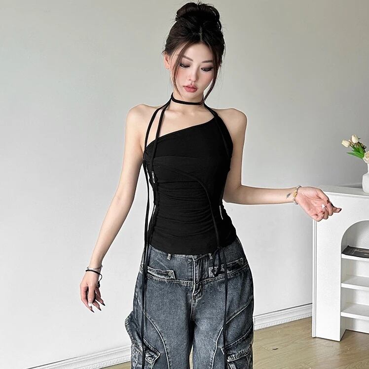 キャミソール チョーカー アシメ ホルターネック トップス インナー 韓国 ストリート系 ダンス 衣装 K-POP HIPHOP Y2Kファッション レディース 9T-114