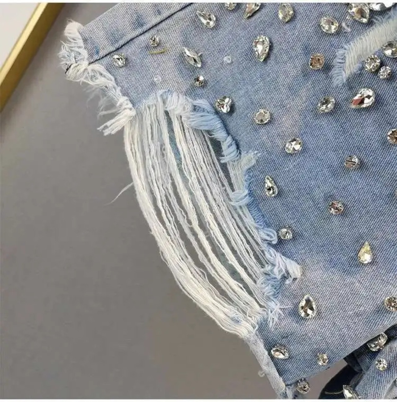 切りっぱなしのラフな裾に、ビジューがぎっしり散りばめられたデザイン。