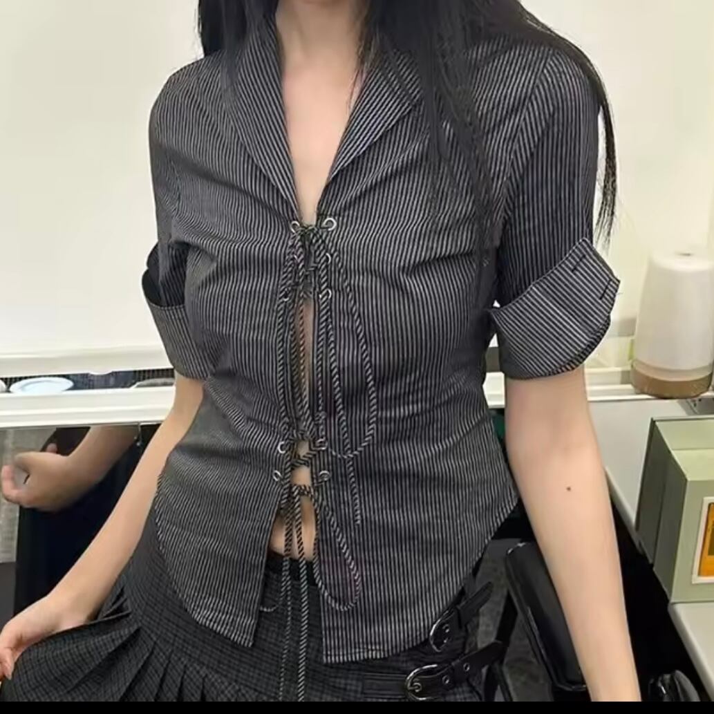 編み上げ シャツ ストライプ柄 開襟 Vネック 韓国 ストリート系 ダンス 衣装 K-POP レディース 9T-141