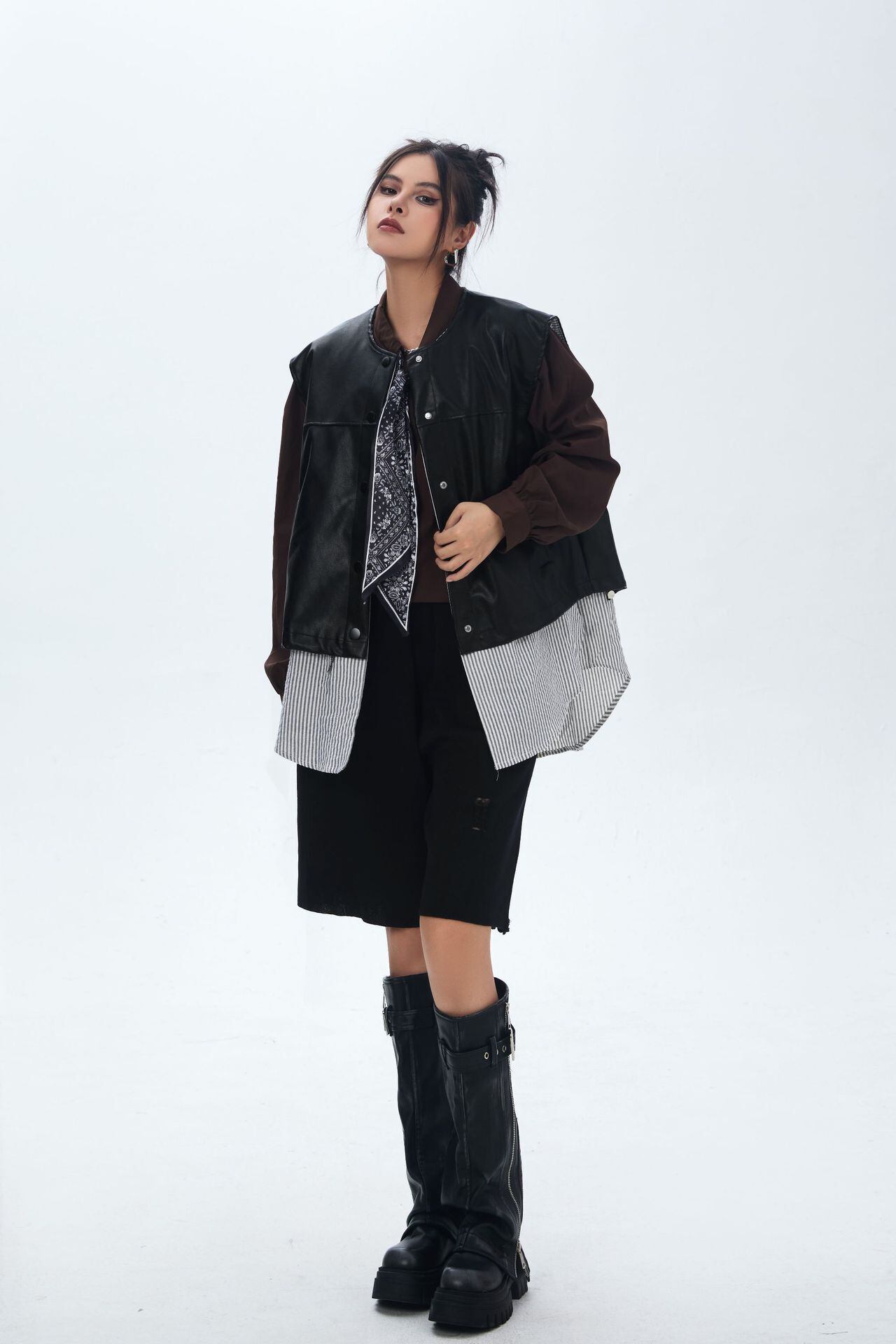 ストライプ柄シャツとフェイクレザーを切り替えた、重ね着風のデザインが目を惹く一枚。