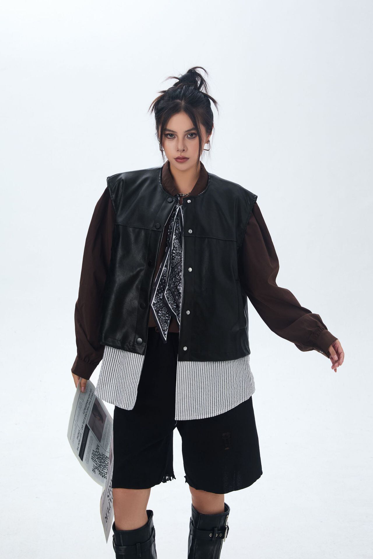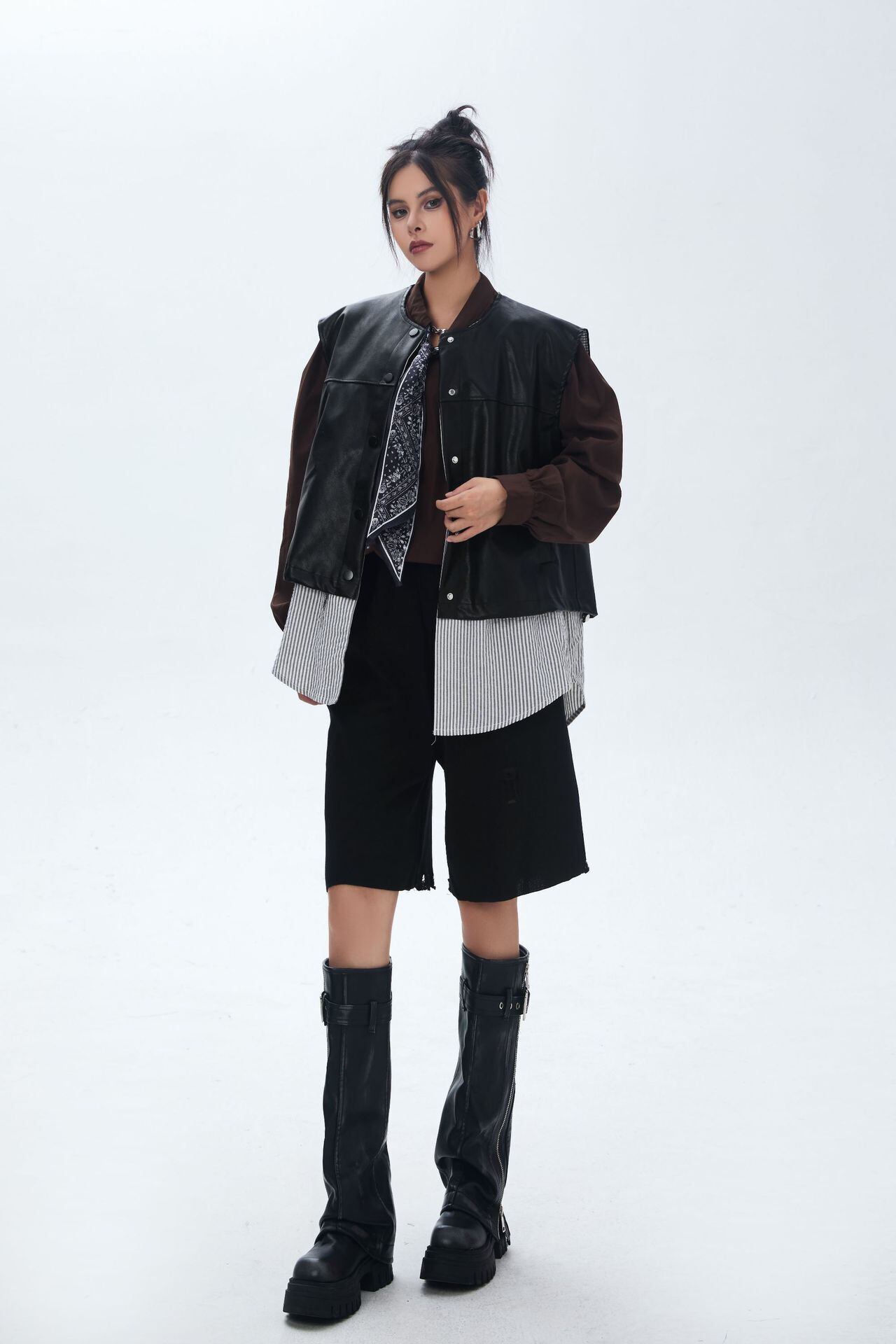 シャツ部分はラウンドヘムで動きがあり、ベストとのコントラストがスタイル全体に奥行きをプラス。