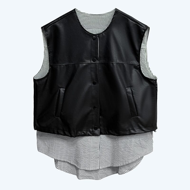 レザー ベスト ジレ 重ね着風 ストライプ柄 韓国 ストリート モード系 ダンス 衣装 K-POP レディース 9T-142