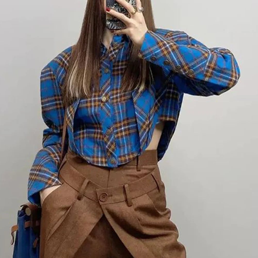 クラシックな青×ブラウンのチェック柄に、サイドの大胆なカッティングを加えた、ひとクセあるデザイン。ショート丈でウエストまわりに抜け感をつくりながら、長袖でバランスを保つことで、肌見せがヘルシーに、スタイリングに芯を与えてくれます。