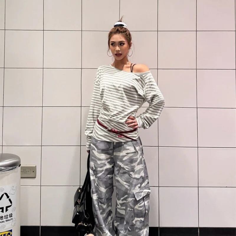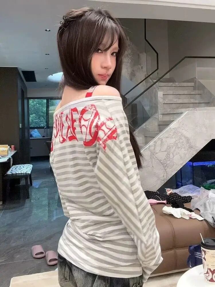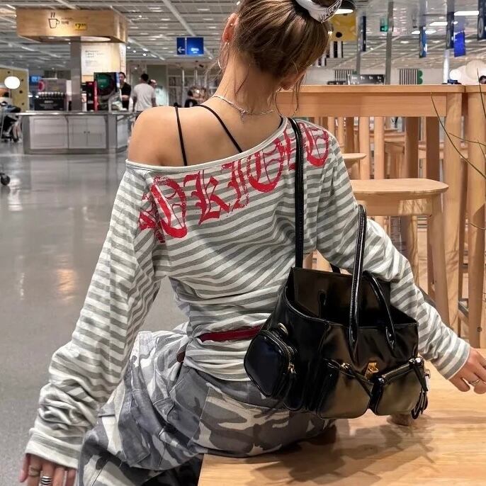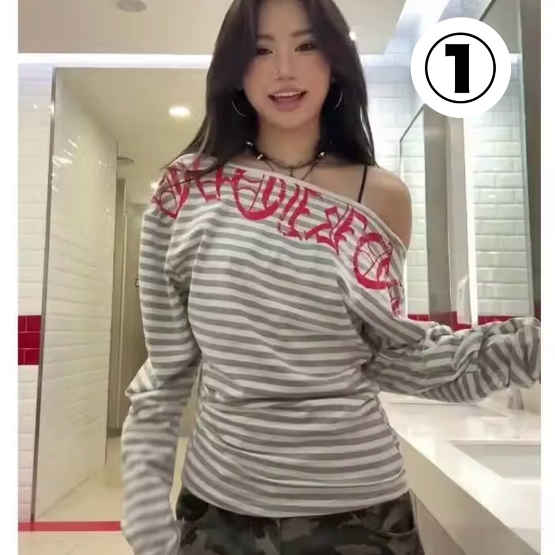 オフショル Tシャツ ロンT 長袖 トップス ボーダー柄 ロゴ 韓国 ストリート ギャル ダンス 衣装 K-POP 秋 春 レディース 9T-149
