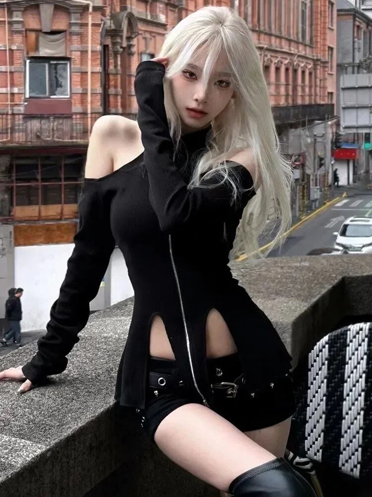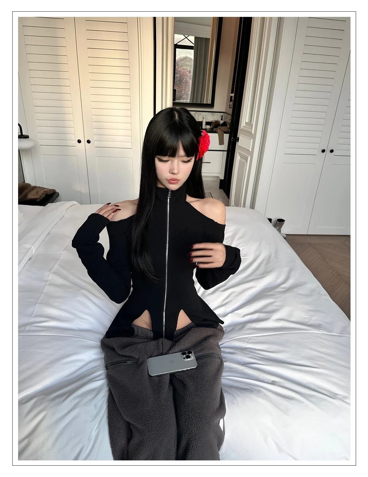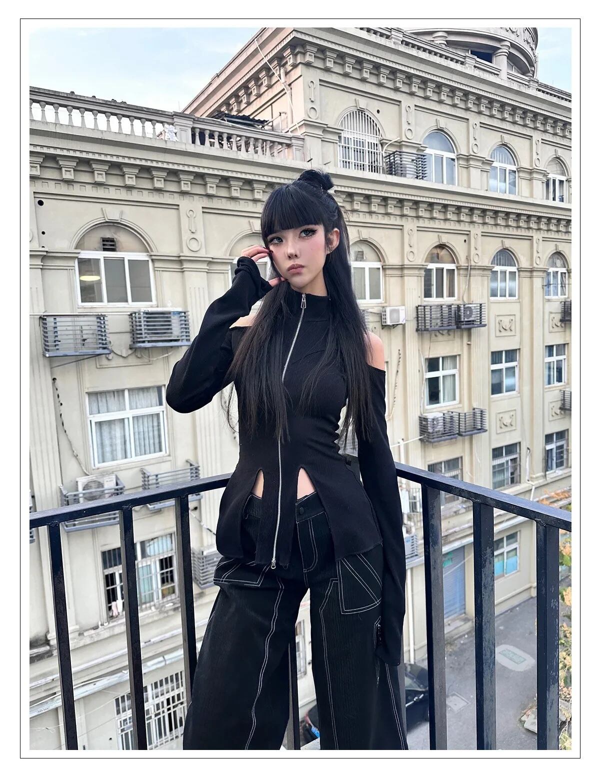 オフショル ロンT トップス 長袖 アシンメトリー ファスナー 韓国 ストリート モード系 ダンス 衣装 K-POP ギャル 秋 春 レディース 9T-150
