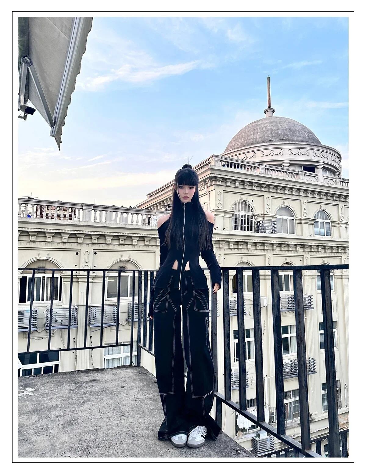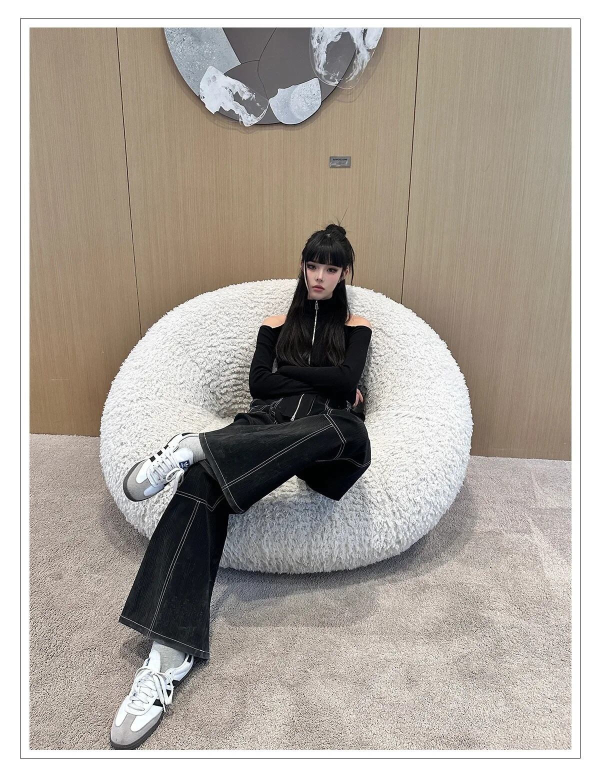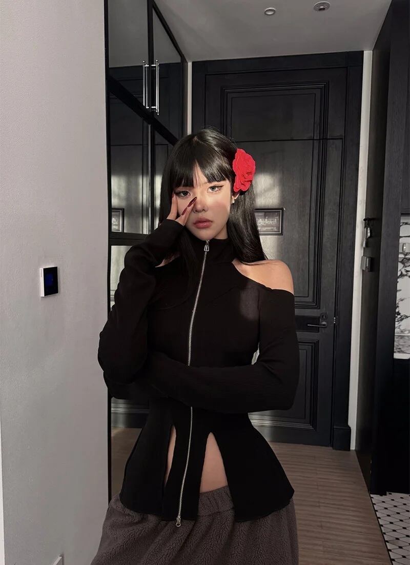 オフショル ロンT トップス 長袖 アシンメトリー ファスナー 韓国 ストリート モード系 ダンス 衣装 K-POP ギャル 秋 春 レディース 9T-150