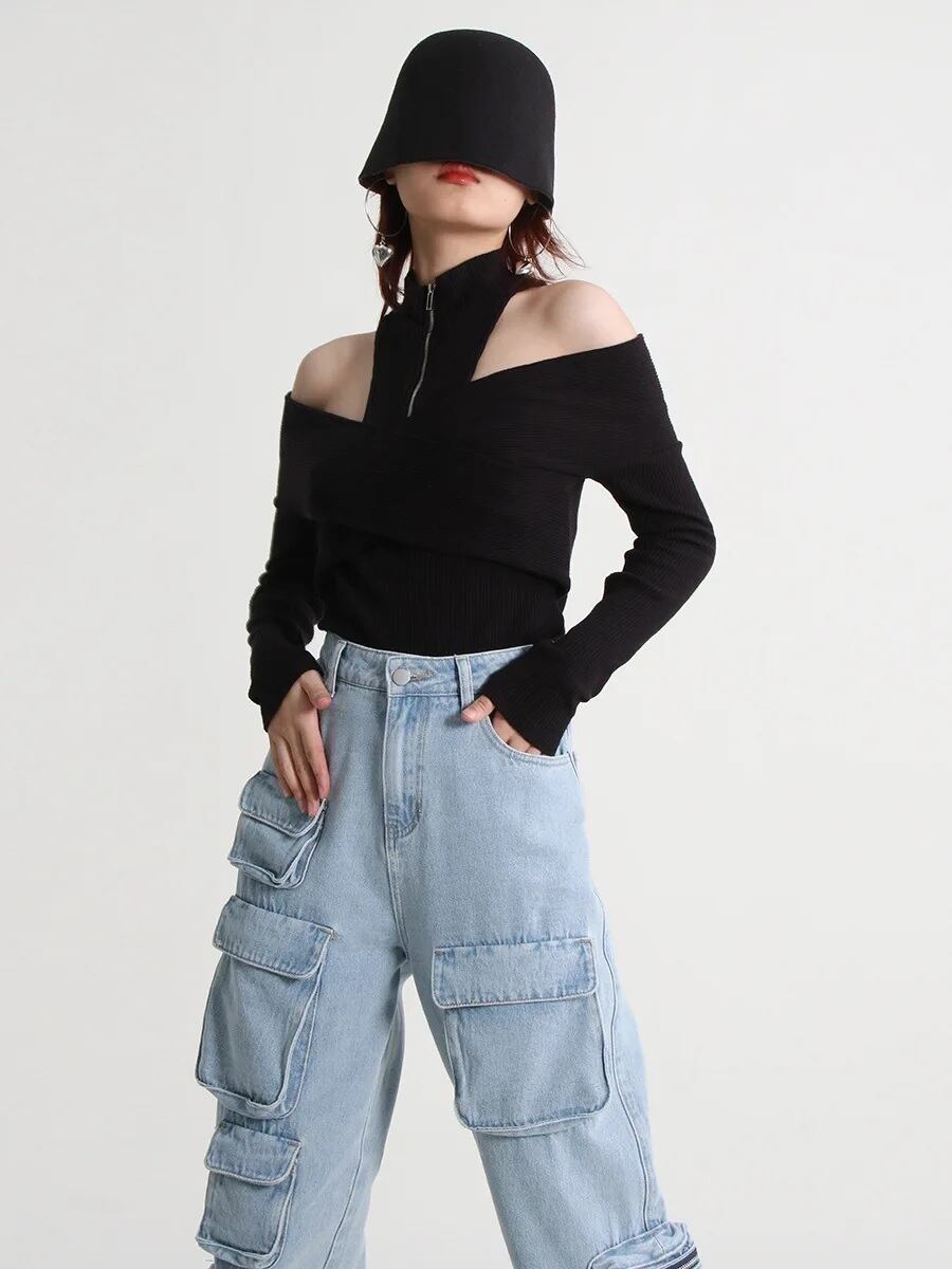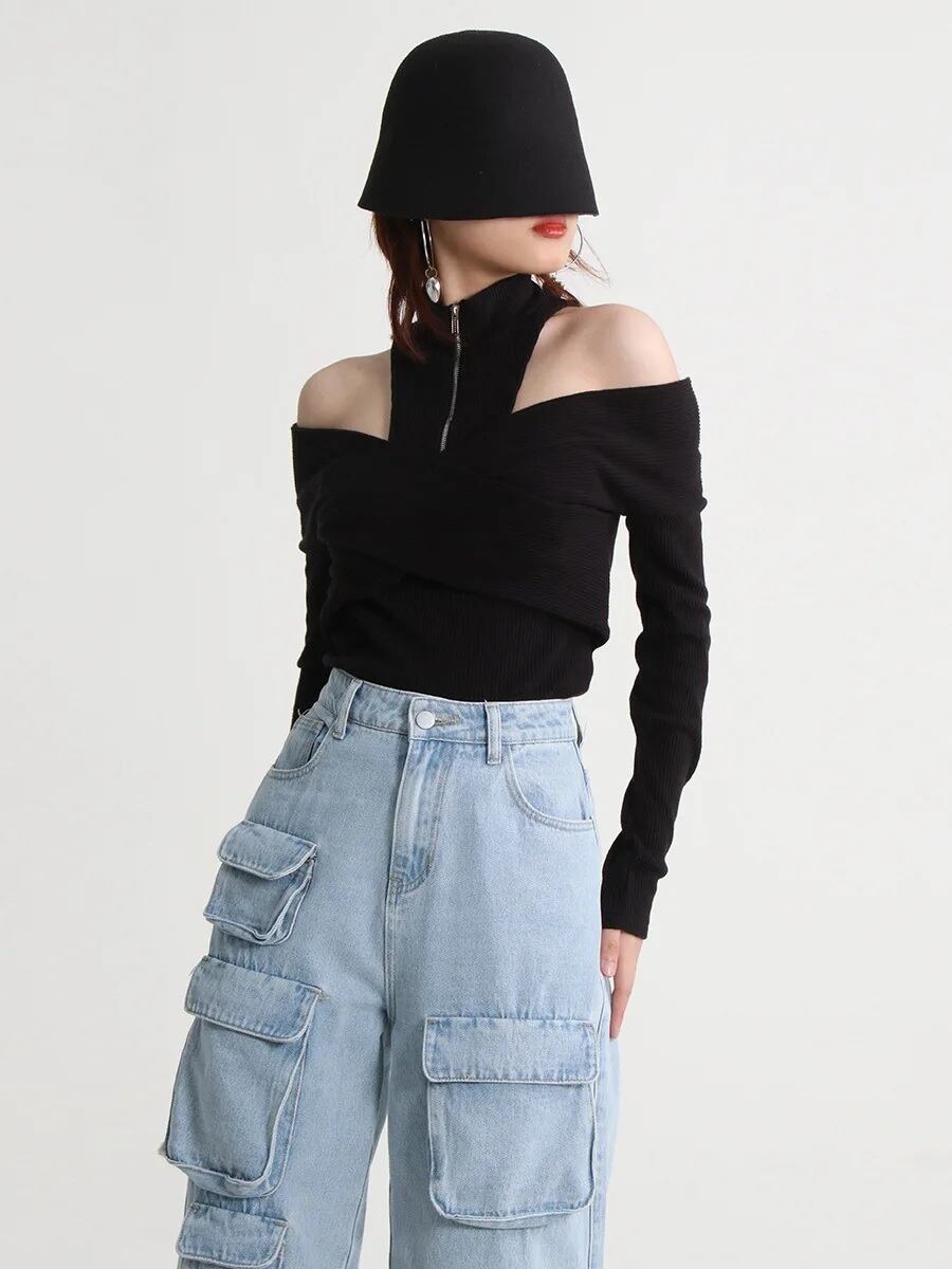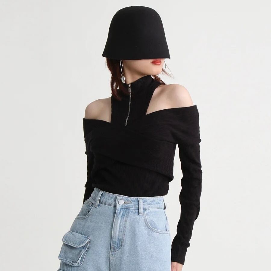 ★カシュクール風×ファスナーで魅せる、オフショルニットトップス