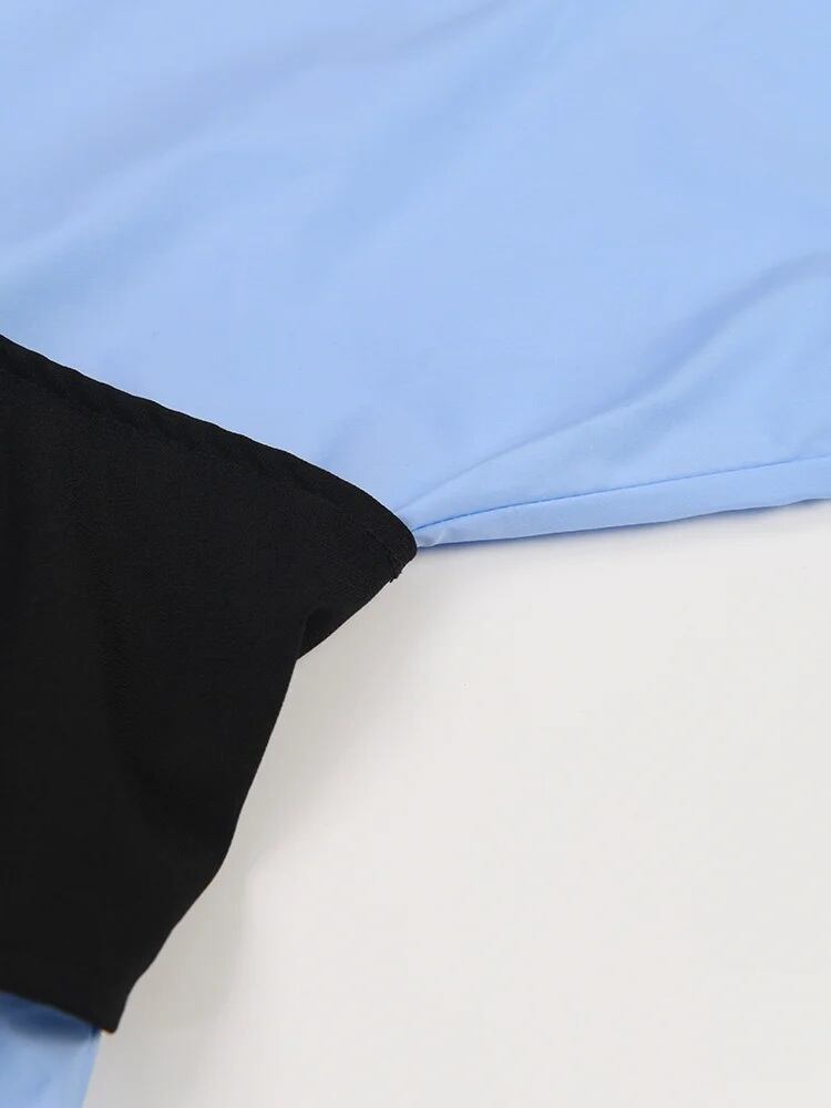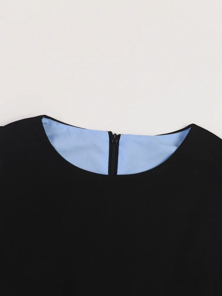 ブラックのアシンメトリーなレイヤーがライトブルーのベースを引き立てて、1枚でお洒落上級者なモードコーデが完成します。