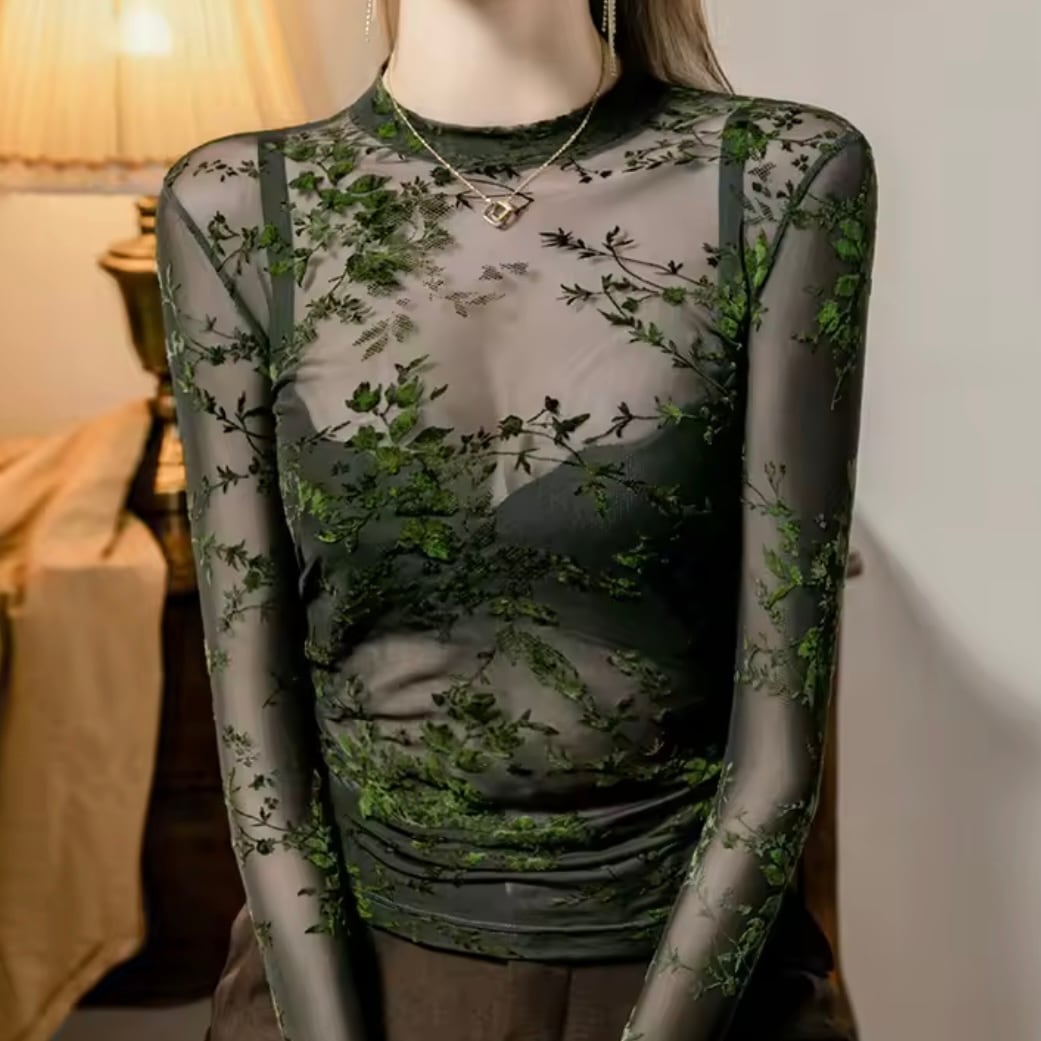 ★透け感と質感で魅せる、ベロア柄のシアートップス