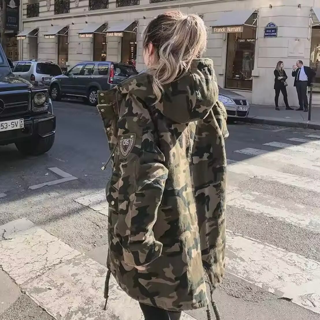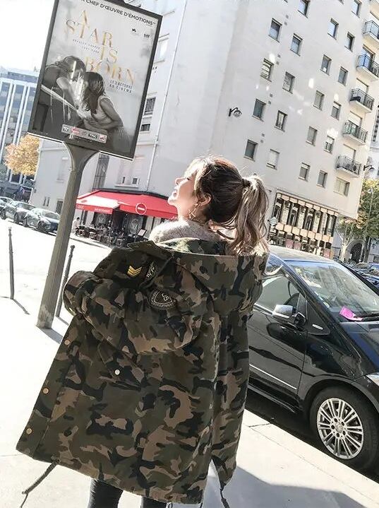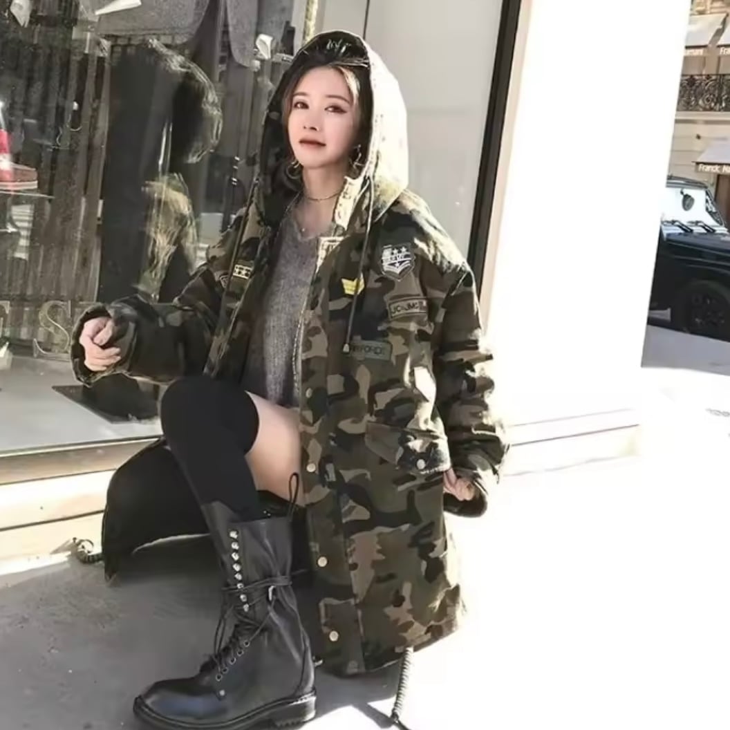 迷彩柄 パーカー コート モッズコート ワッペン 韓国 ストリート レディース カモフラ ロング フード ギャル グランジ 冬 秋 アウター 9AU-11