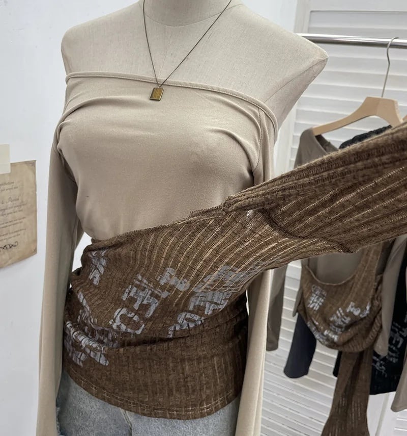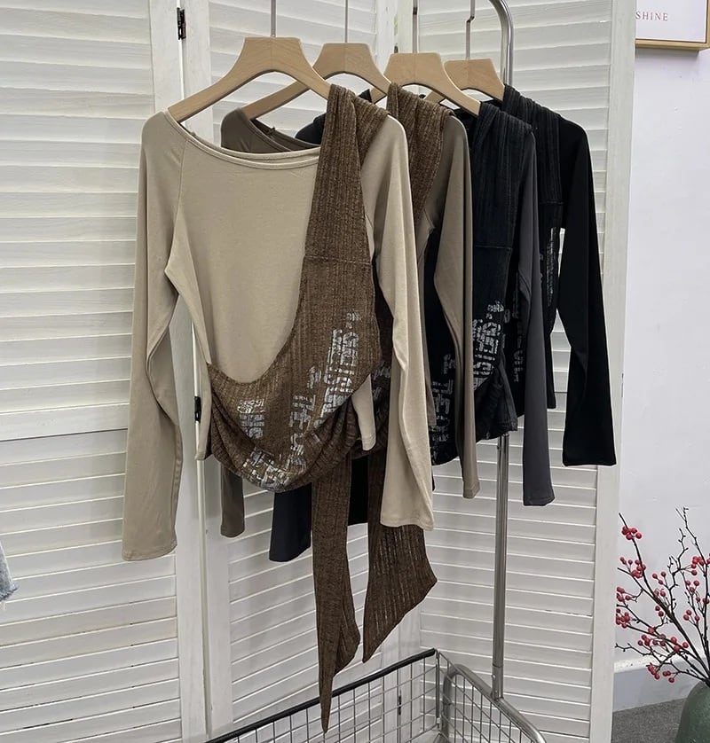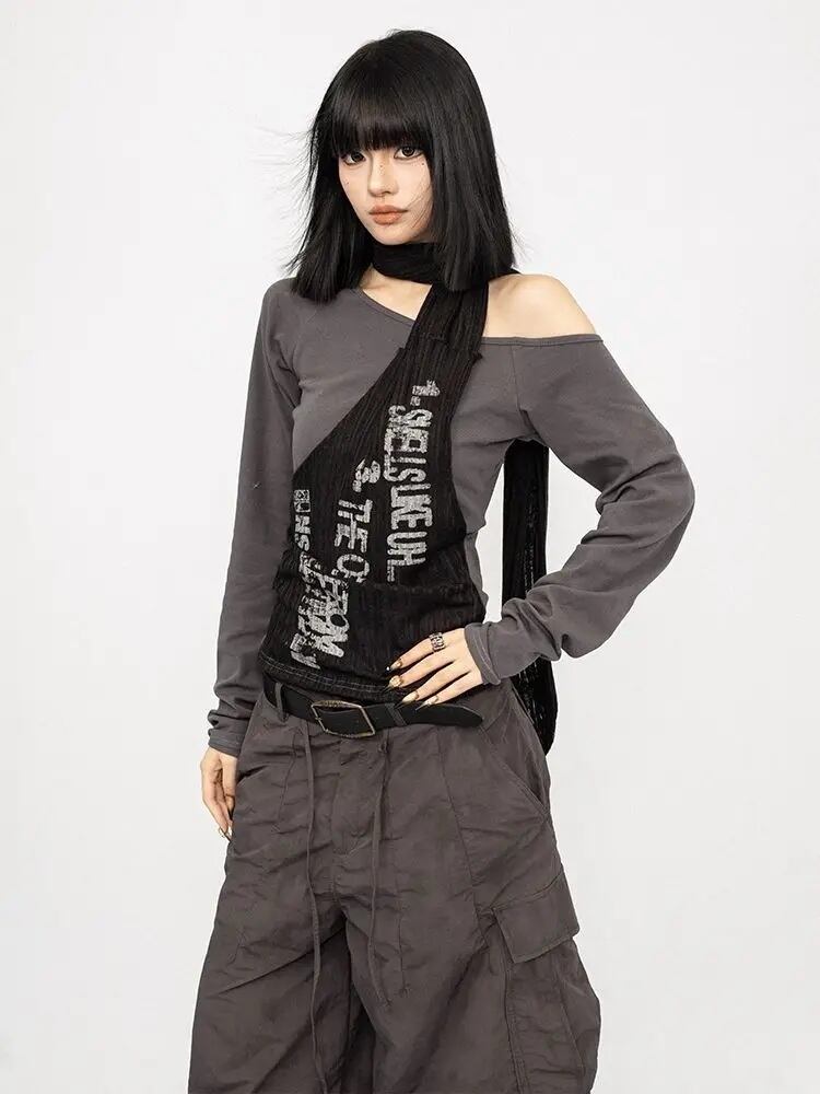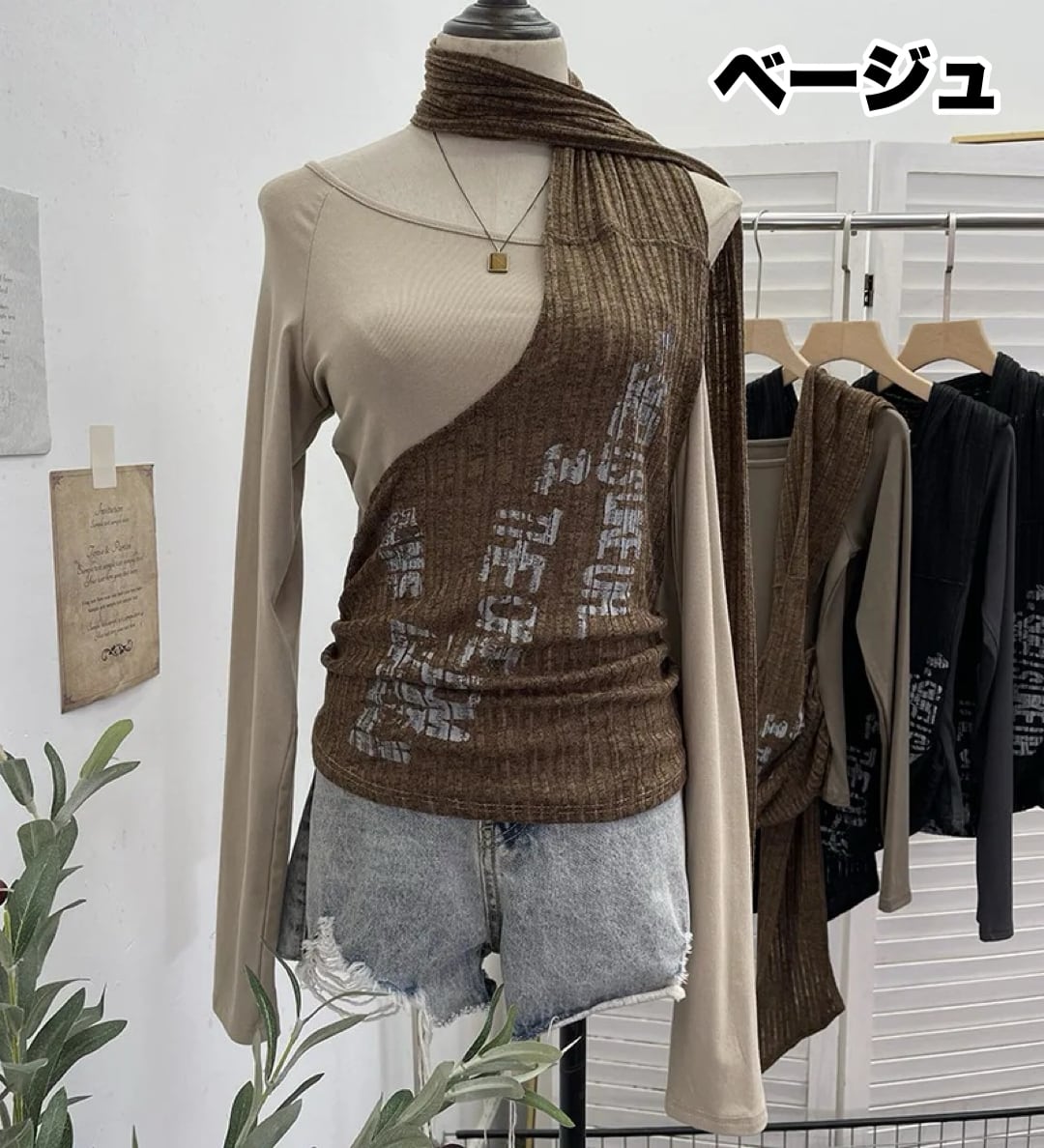重ね着風 オフショル ロンT トップス 長袖 Tシャツ ロゴ 韓国 ストリート モード系 ギャル レディース 9T-167
