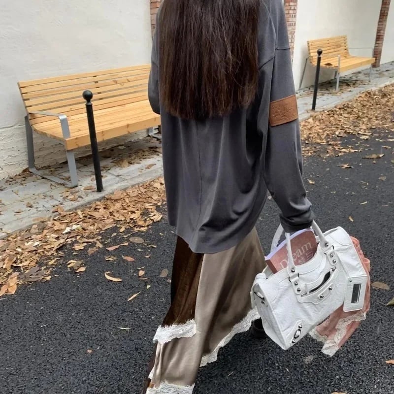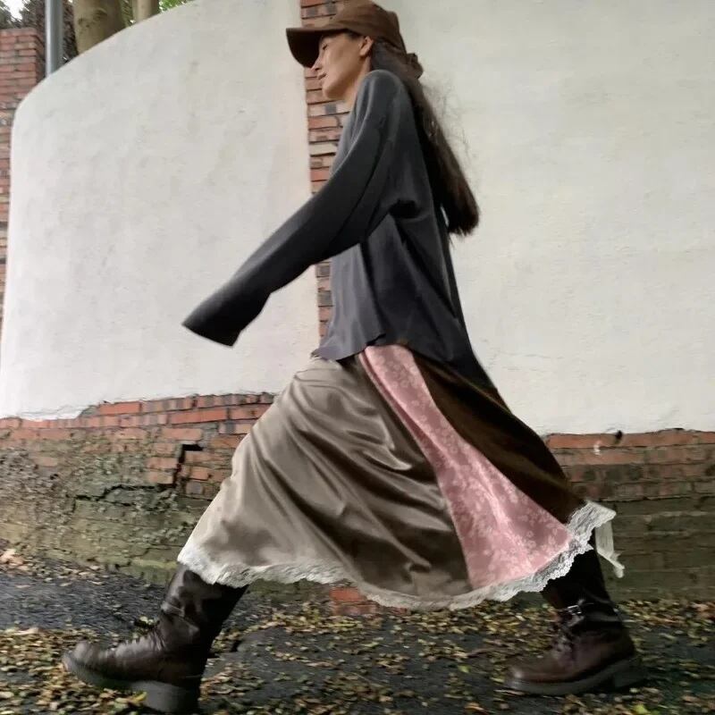ロング スカート サテン 花柄 パッチワーク 韓国 ストリート モード系 レディース 9SK-15