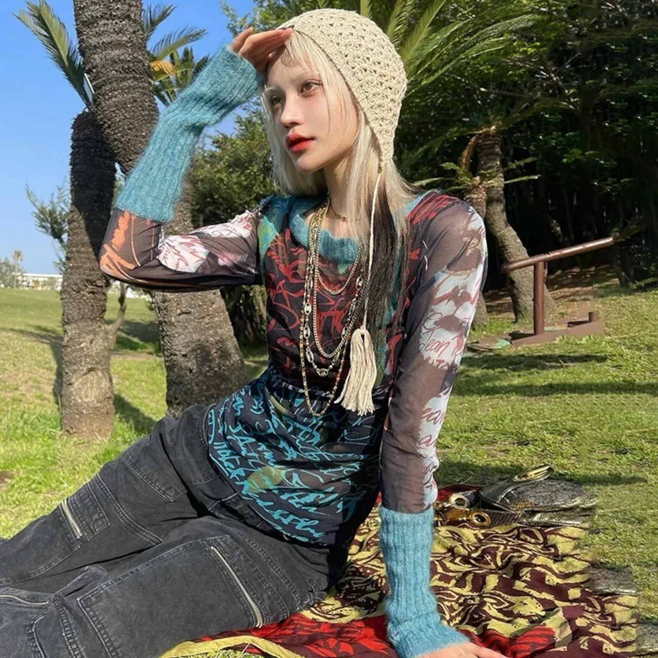 シアー トップス ロンT 長袖 ロゴ ニット ダンス 衣装 韓国 ストリート系 Y2K ギャル K-POP HIPHOP レディース 9T-170