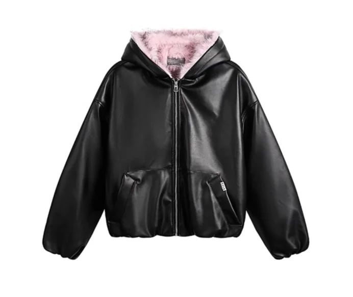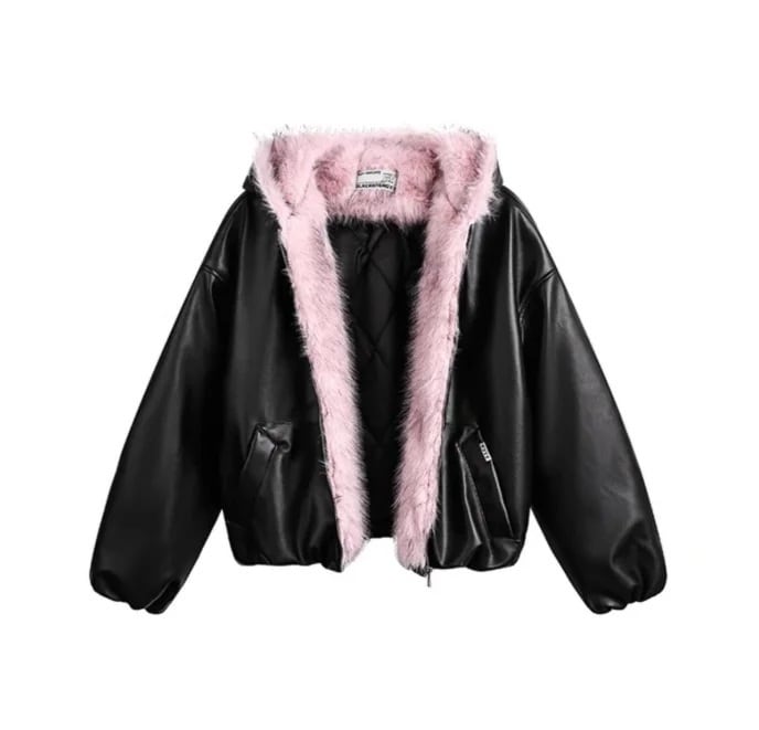 レザーのぱりっとした質感に、フード裏やファスナーまわりにあしらわれたピンクファーが絶妙なアクセント。