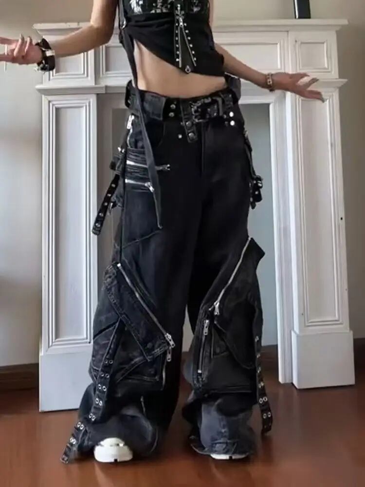 デニム カーゴ パンツ マルチ ポケット ストラップ 韓国 ストリート系 ダンス 衣装 K-POP HIPHOP グランジ 黒 レディース 9J-74