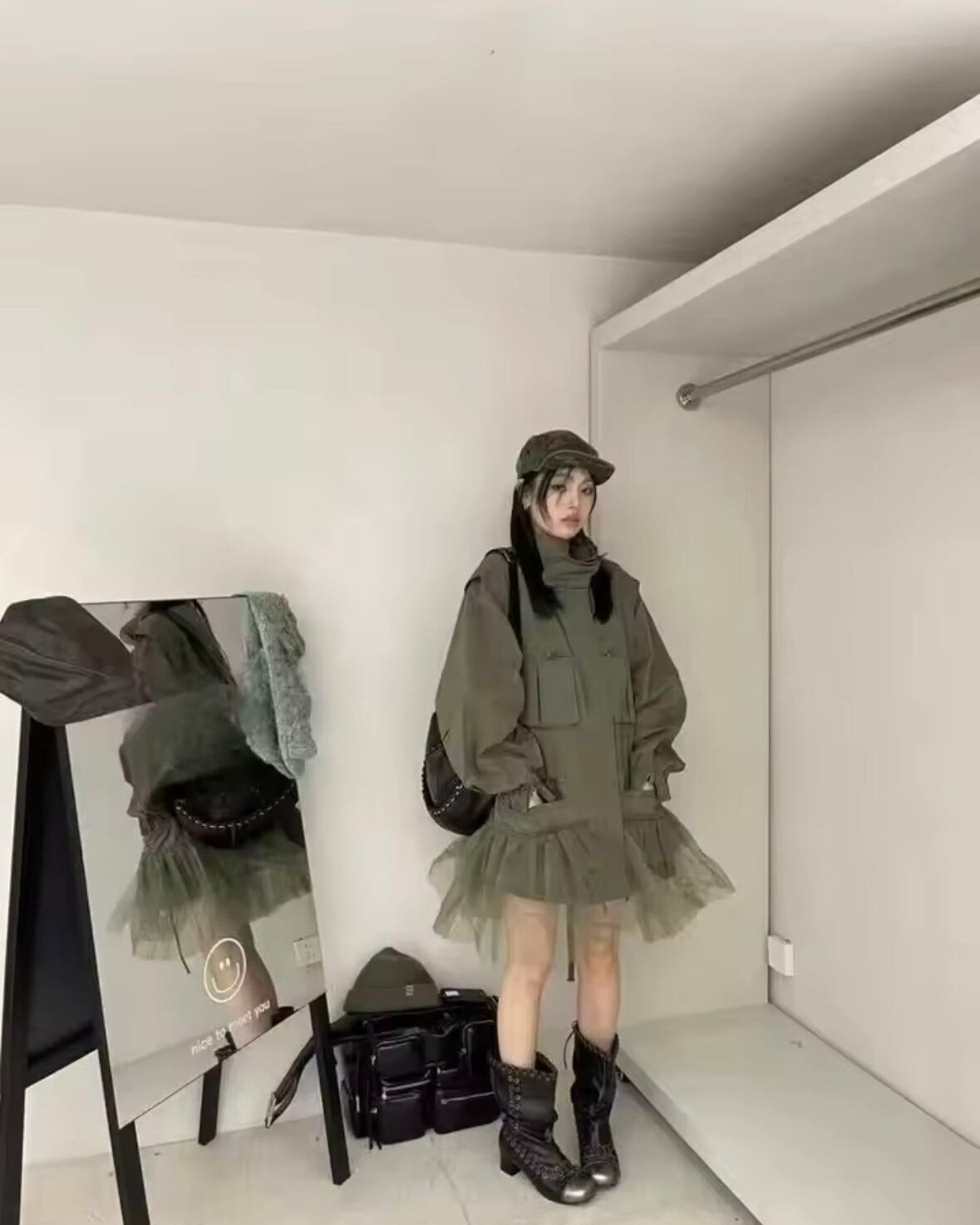 メンズライクなミリタリーアイテムに、軽やかさと遊び心を添えてくれるチュールの揺れ感がポイントです。