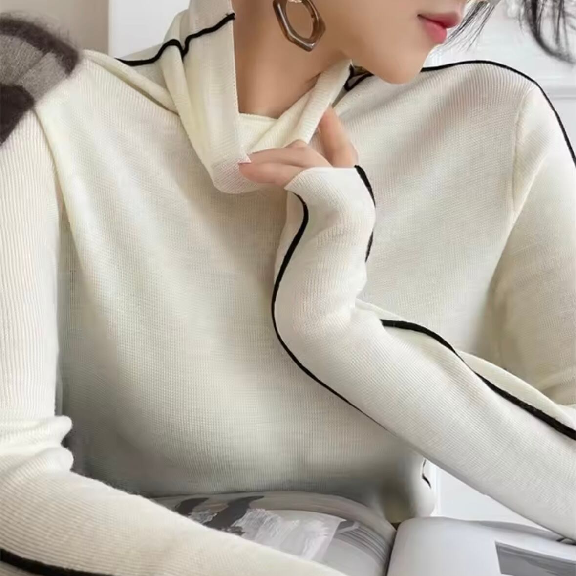 ★ライン使いが程よくアクセントになるハイネックニットトップス。