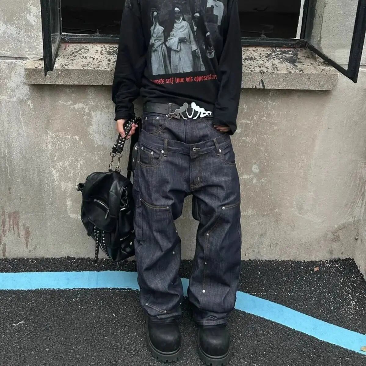 ダブルウエスト デニム パンツ ジーンズ リベット 韓国 ストリート モード系 ダンス 衣装 グランジ オピウム K-POP HIPHOP レディース 9J-76