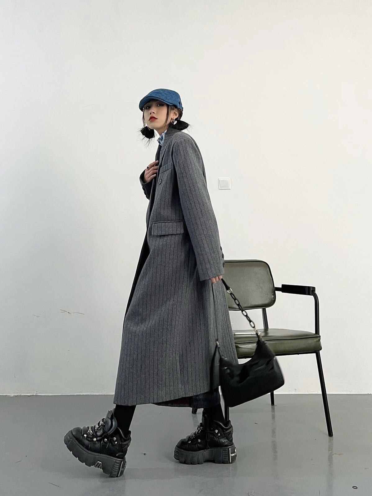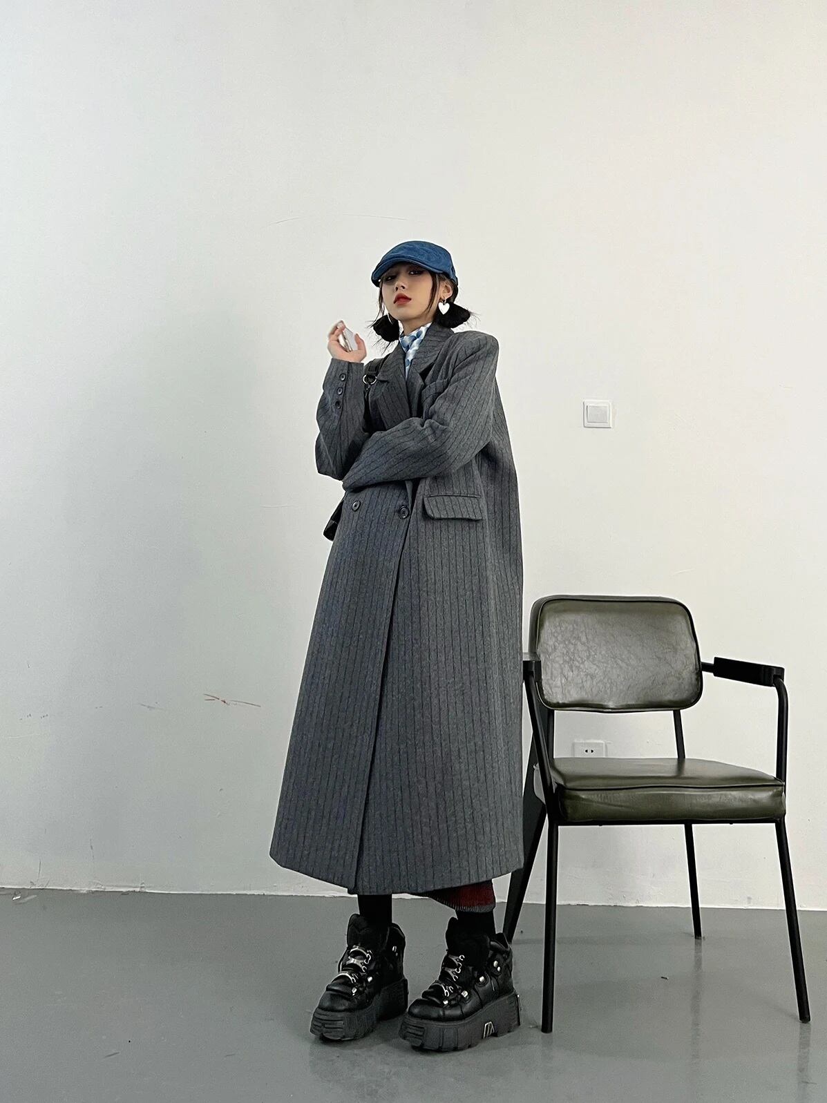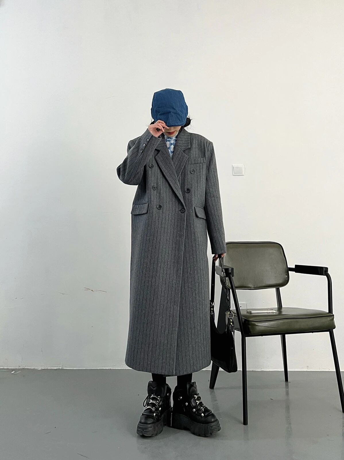ロング コート チェスター コート ストライプ柄 ウール調 韓国 ストリート モード系 レディース 9AU-36