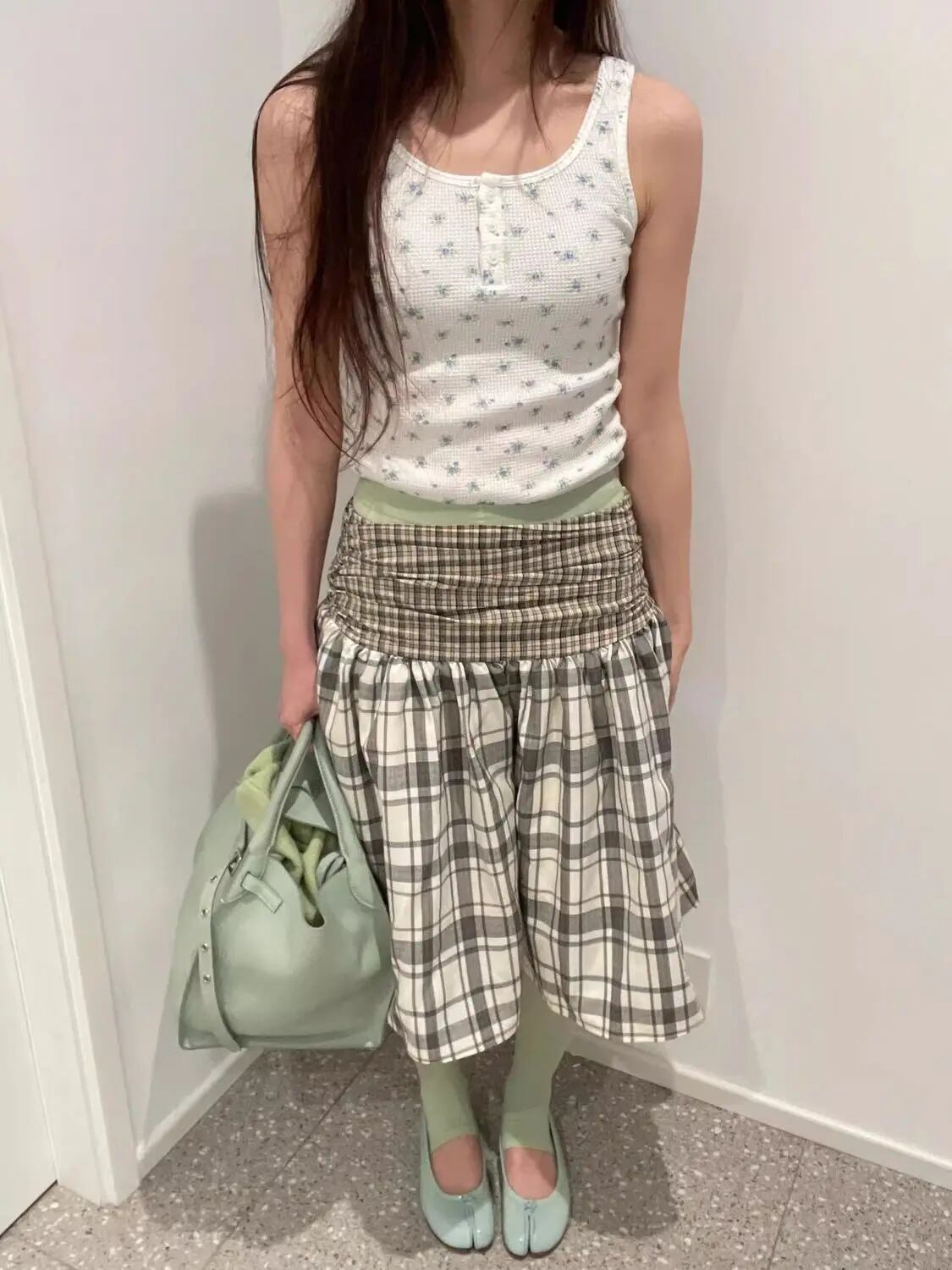 チェック柄 スカート ミディ丈 ウエストゴム 2way シャーリング 韓国 ストリート バレエコア Y2K レディース 10SK-3
