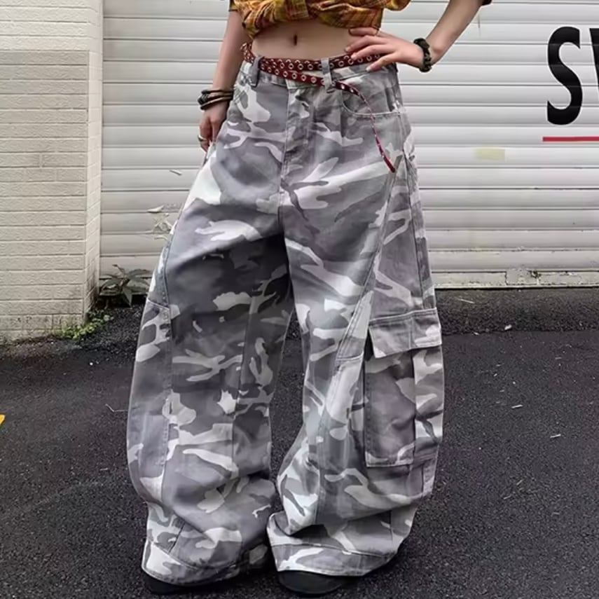 迷彩 カーゴ パンツ ワイド 韓国 ストリート Y2K ダンス 衣装 カモフラ ルーズ グレー K-POP HIPHOP レディース 10PA-3
