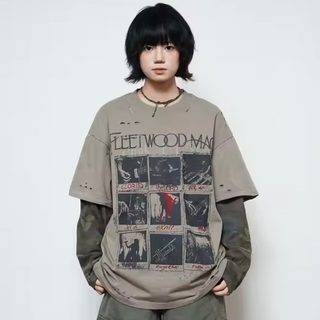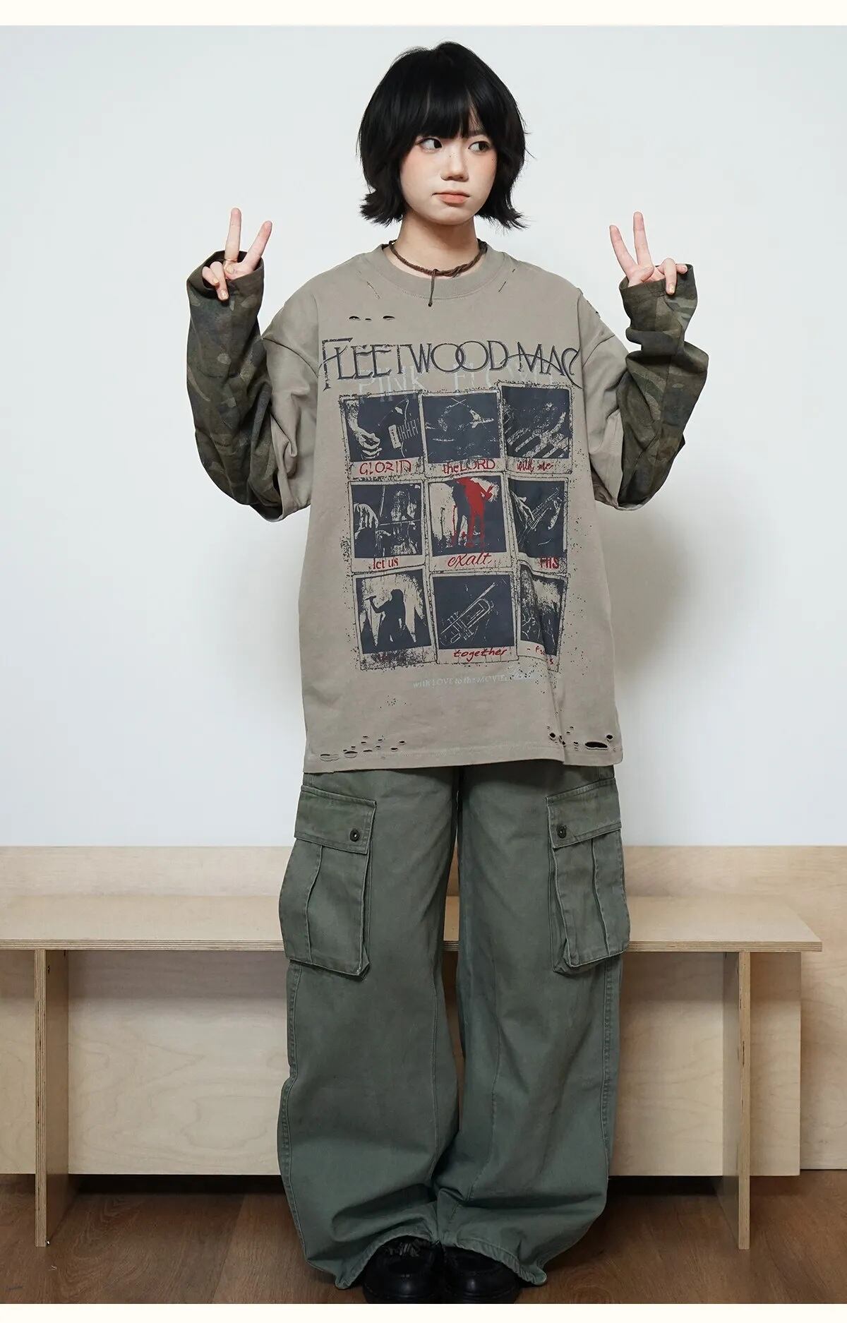 重ね着風 ロンT Tシャツ 長袖 迷彩柄 バンドT ダメージ加工 韓国 ストリート ダンス 衣装 K-POP HIPHOP グランジ レディース 10T-5