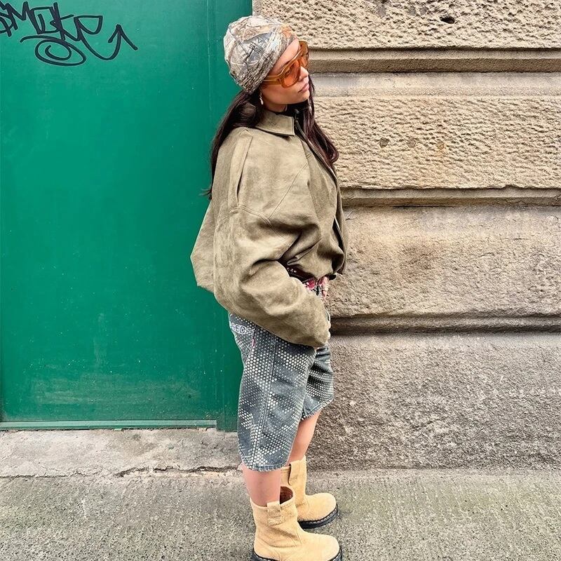 スウェード ジャケット ブルゾン ショート丈 韓国 海外 ストリート ミリタリー ワークジャケット オーバーサイズ レディース 10AU-7