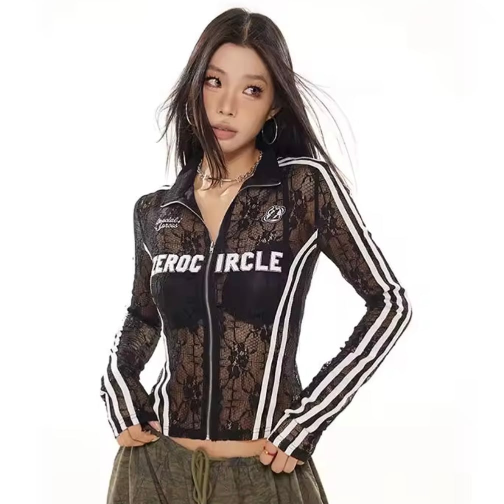 総レース シアー トップス ジップアップ ライン トラックジャケット 長袖 韓国 ストリート Y2K バレエコア ブロケットコア ギャル ダンス 衣装 K-POP レディース 10T-7
