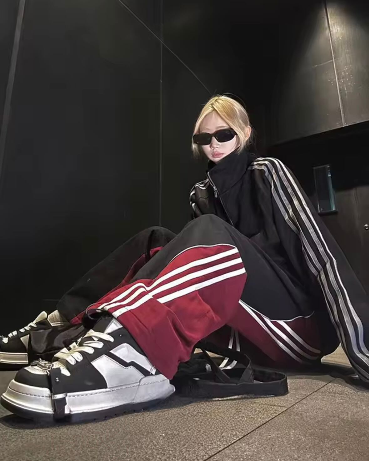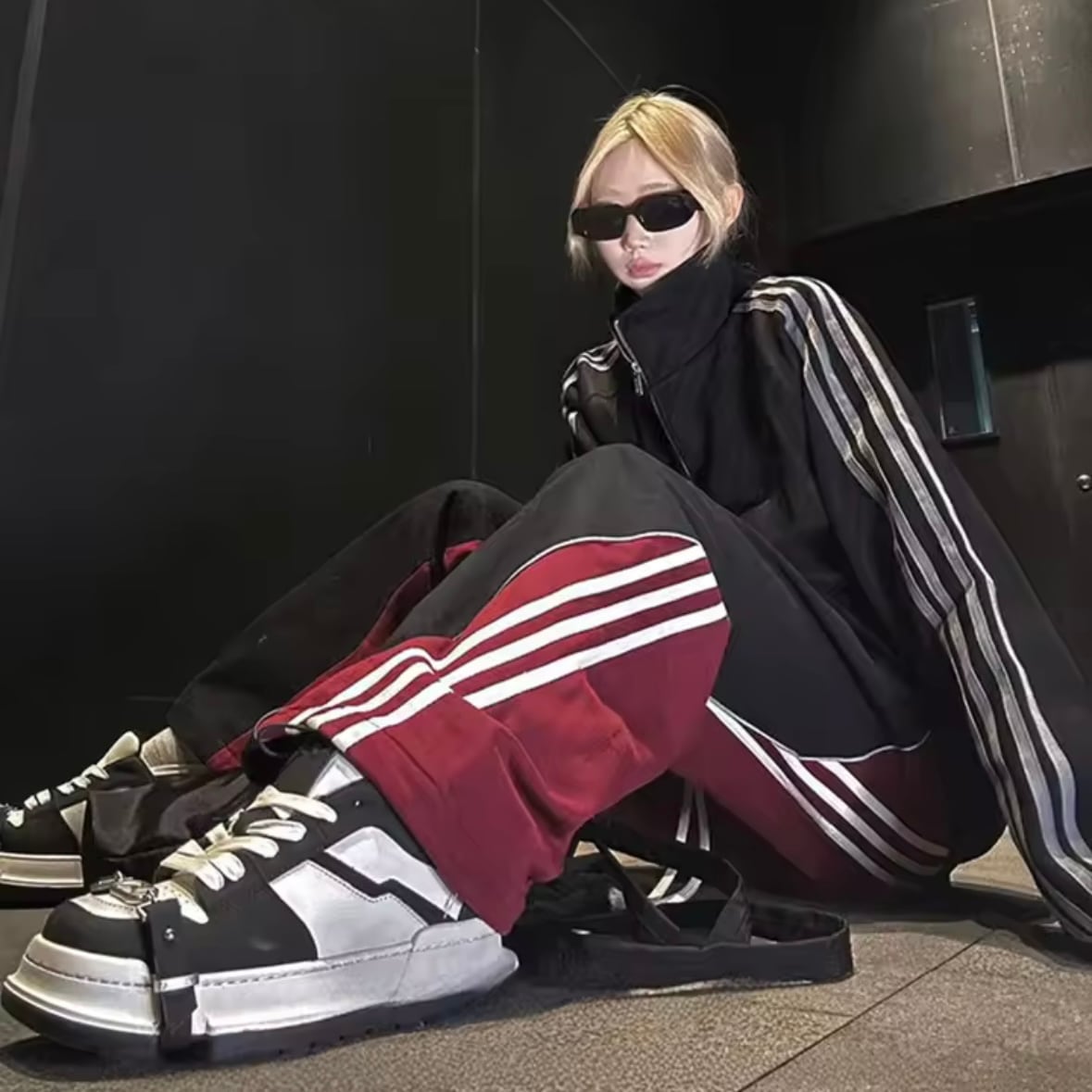 ブラックと深みのあるボルドーをアシンメトリーに配置。サイドにあしらわれた3本ラインが、スポーティーさとモードな雰囲気を絶妙に融合させています。