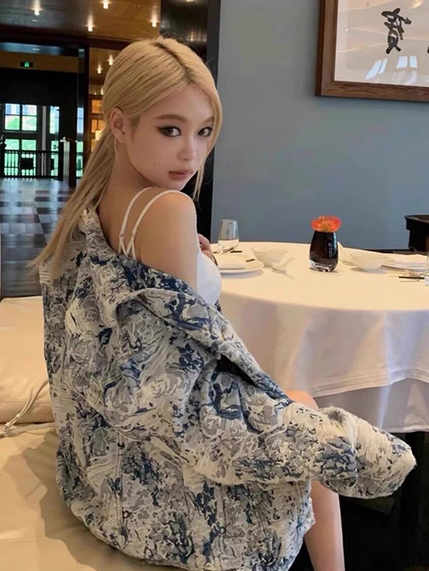 ジャガード ゴブラン デニム ジャケット 総柄 韓国 ストリート Y2K ダンス 衣装 K-POP オーバーサイズ グランジ レディース 10J-3