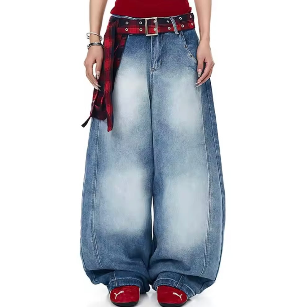 バギー デニム パンツ チェック柄 ベルト付き シャツ巻き風 韓国 ストリート Y2K ダンス 衣装 K-POP ヒップホップ レディース 10J-4