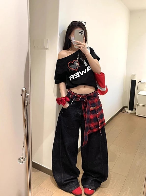 バギー デニム パンツ チェック柄 ベルト付き シャツ巻き風 韓国 ストリート Y2K ダンス 衣装 K-POP ヒップホップ レディース 10J-4