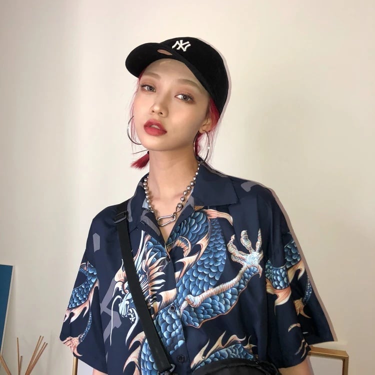 ドラゴン 和柄 龍 プリント シャツ 半袖 青 韓国 ストリート 中華 モード系 サブカル 地雷系 ダンス 衣装 K-POP レディース 10T-13