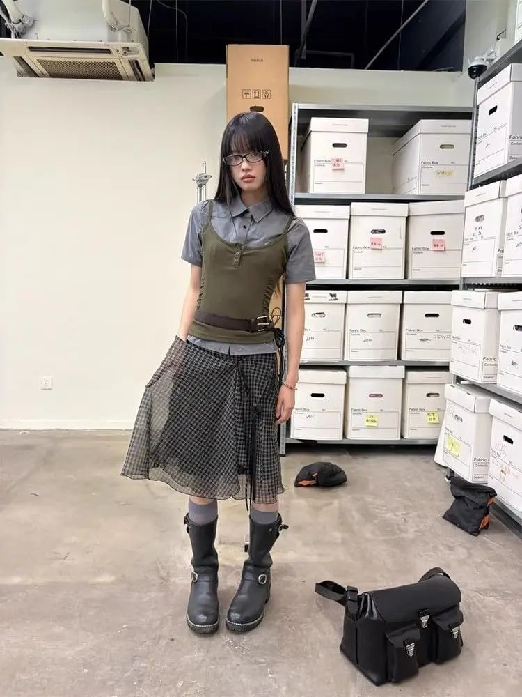 シアー シフォン チェック柄 スカート ミディ丈 韓国 ストリート Y2K グランジ レディース 10SK-7