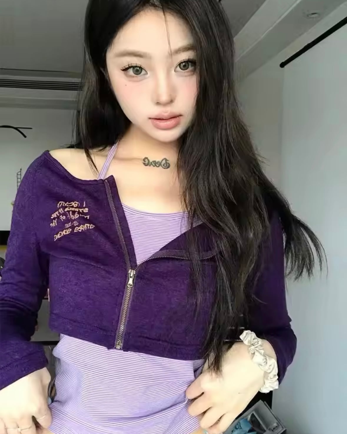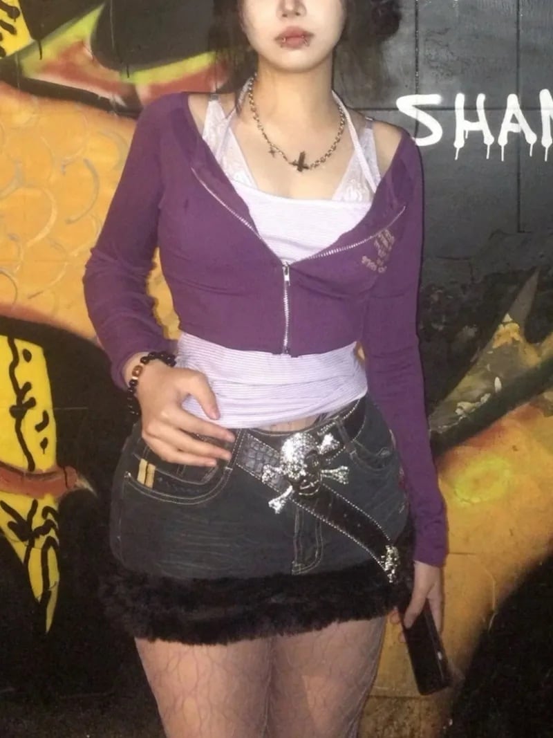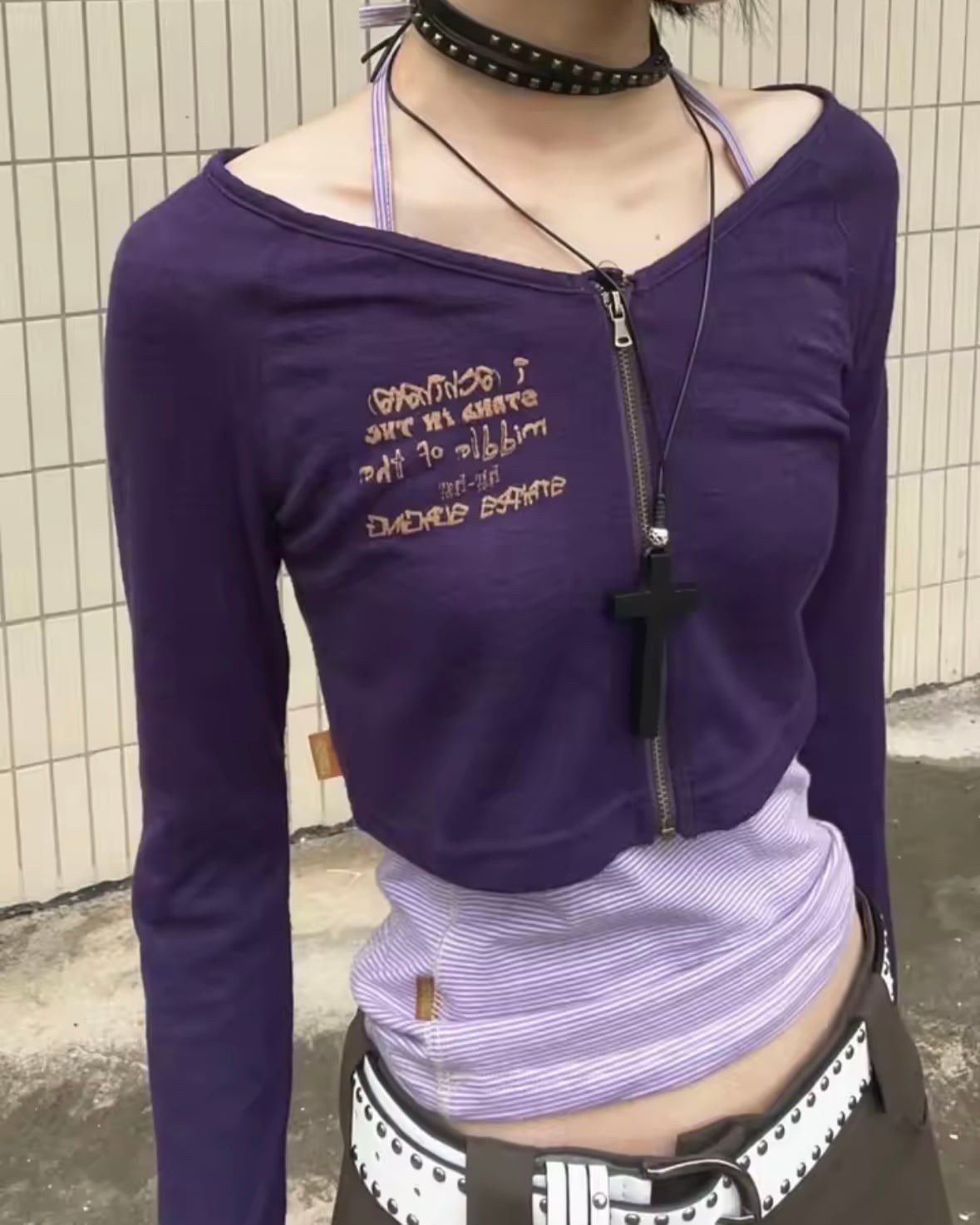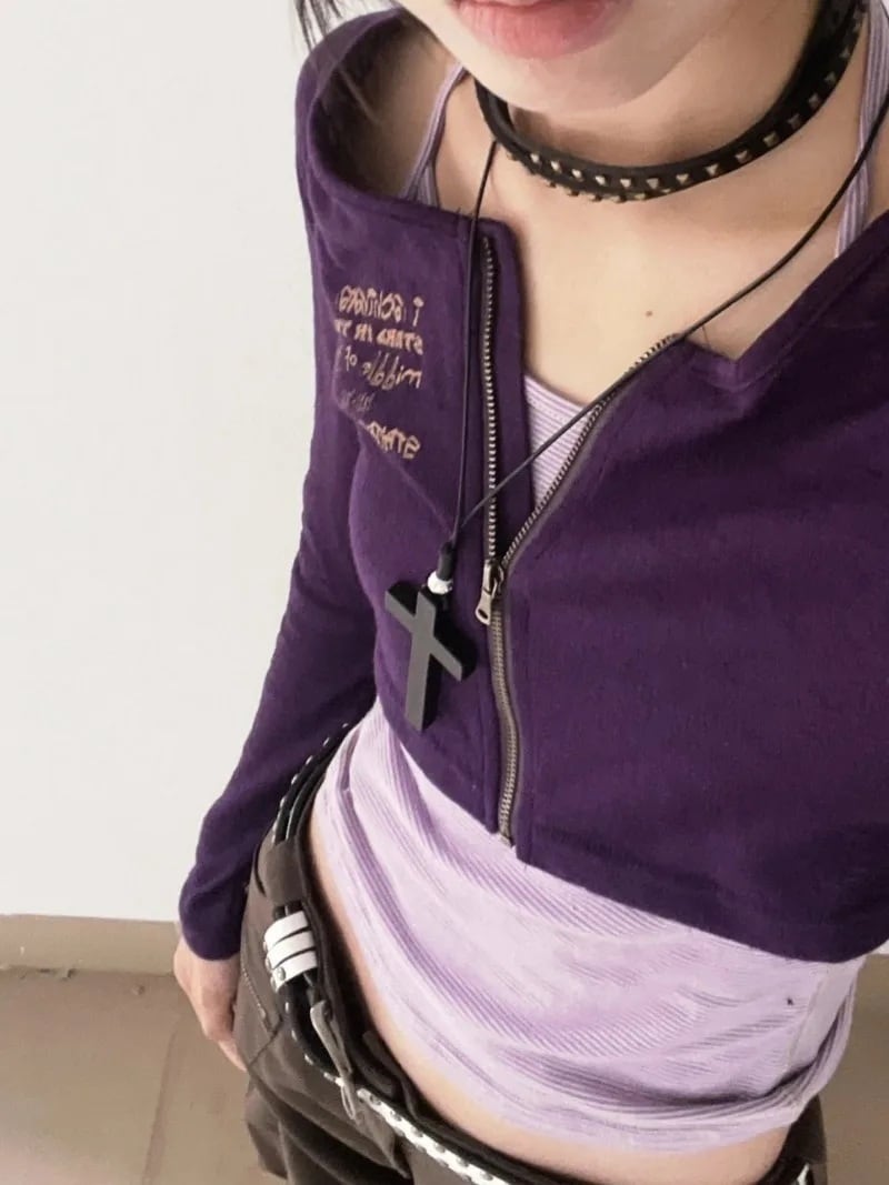 深みのあるパープルのジップアップカーディガンと、軽やかな細ボーダーのホルターネックキャミが織りなす、絶妙なバランスの2点セットです。