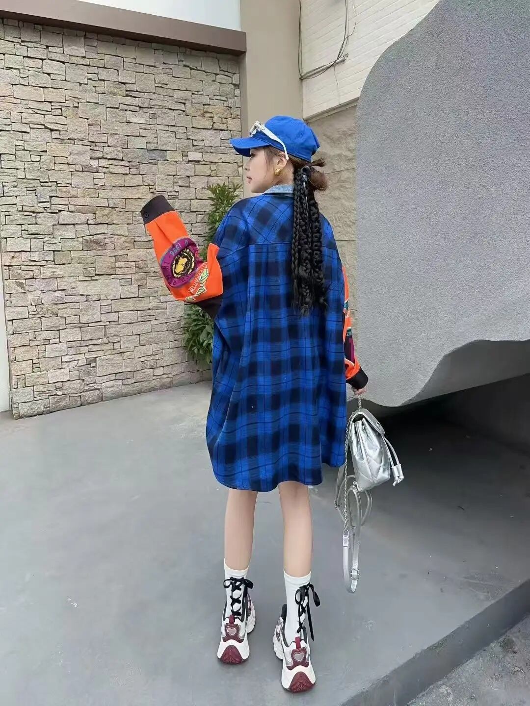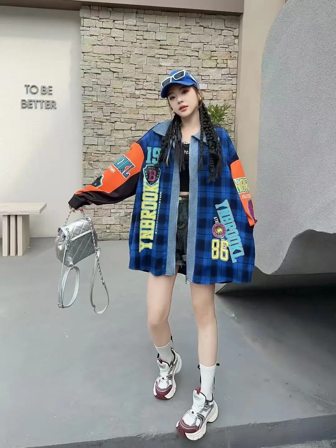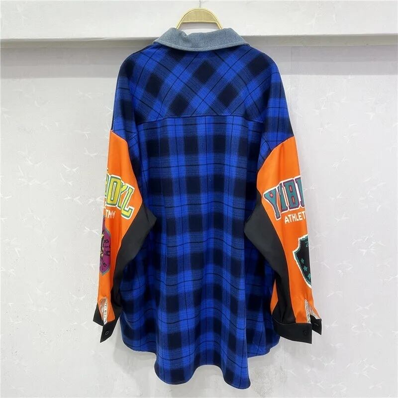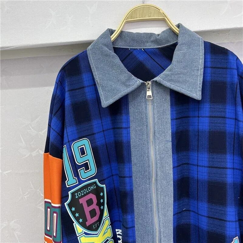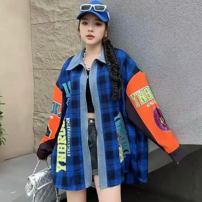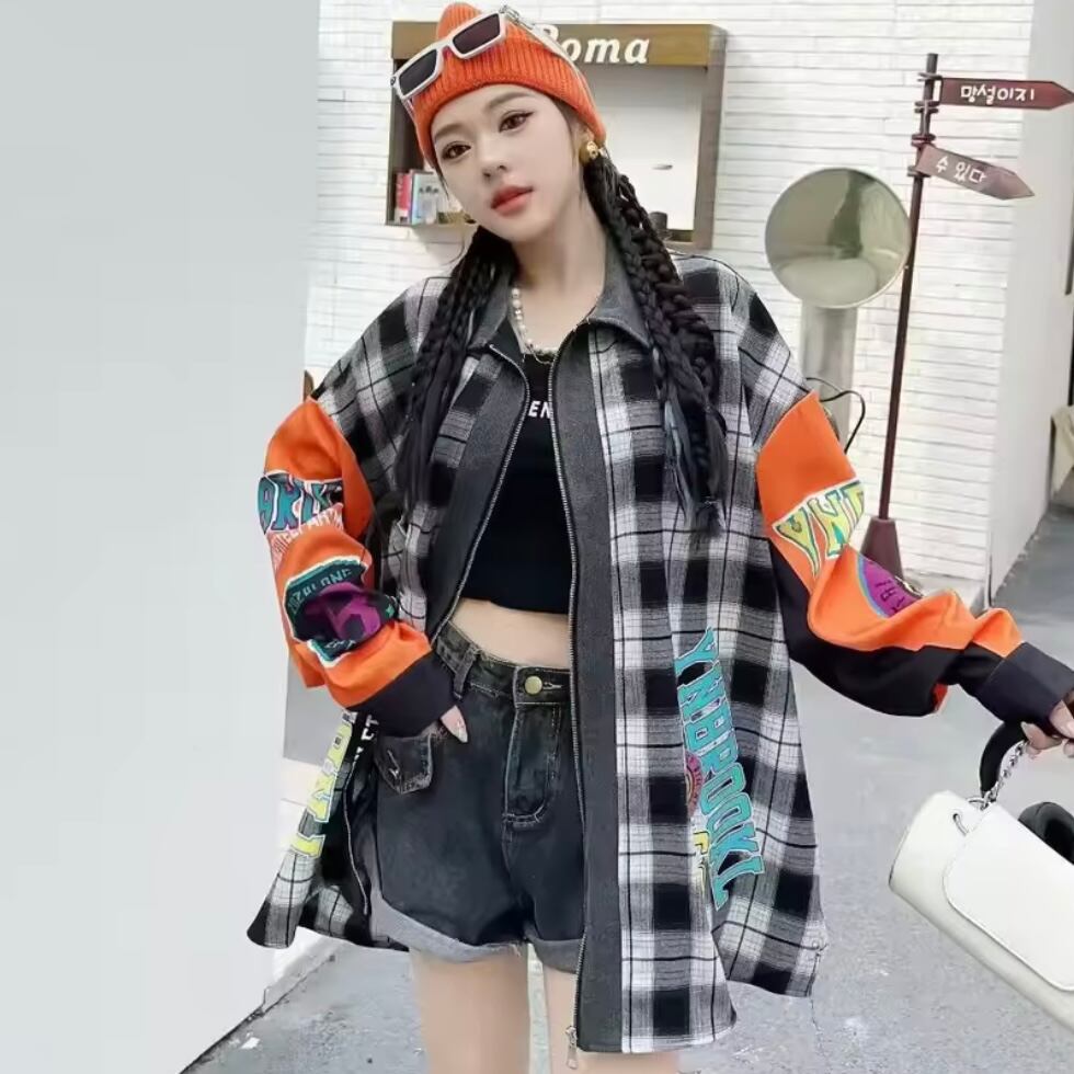 リメイク風 チェック柄 ジップアップ シャツ 長袖 ワッペン ロゴ 韓国 ストリート Y2K グランジ 90' レトロ ダンス 衣装 K-POP HIPHOP レディース 10T-20