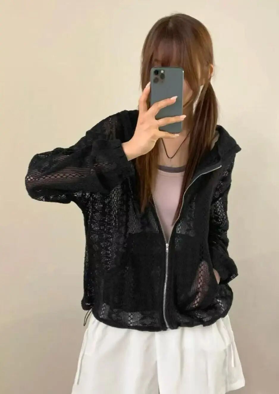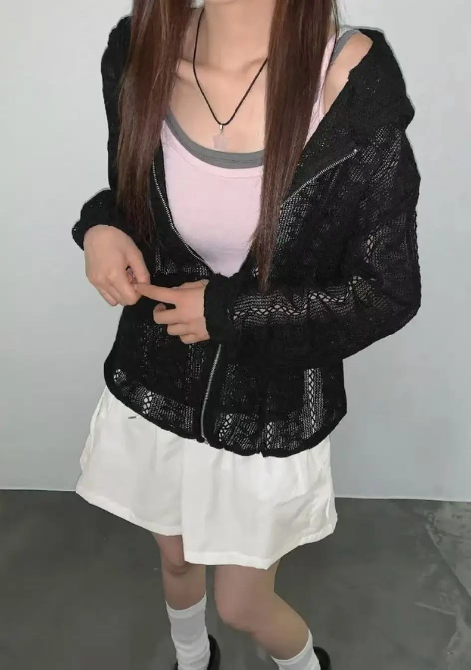 メッシュ サマーニット かぎ編み レース ジップアップ パーカー フーディー 黒 韓国 ストリート バレエコア 夏 レディース 10T-21