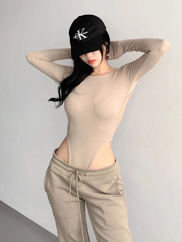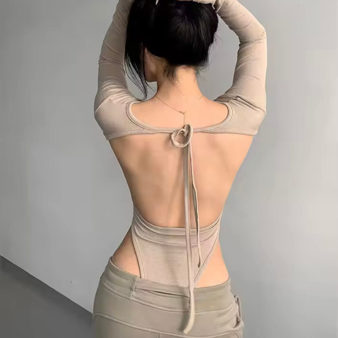 ボディスーツ 背中あき リボン 長袖 ロンT Tシャツ 韓国 ストリート Y2K ダンス 衣装 K-POP HIPHOP ベージュ トップス レディース 10T-23