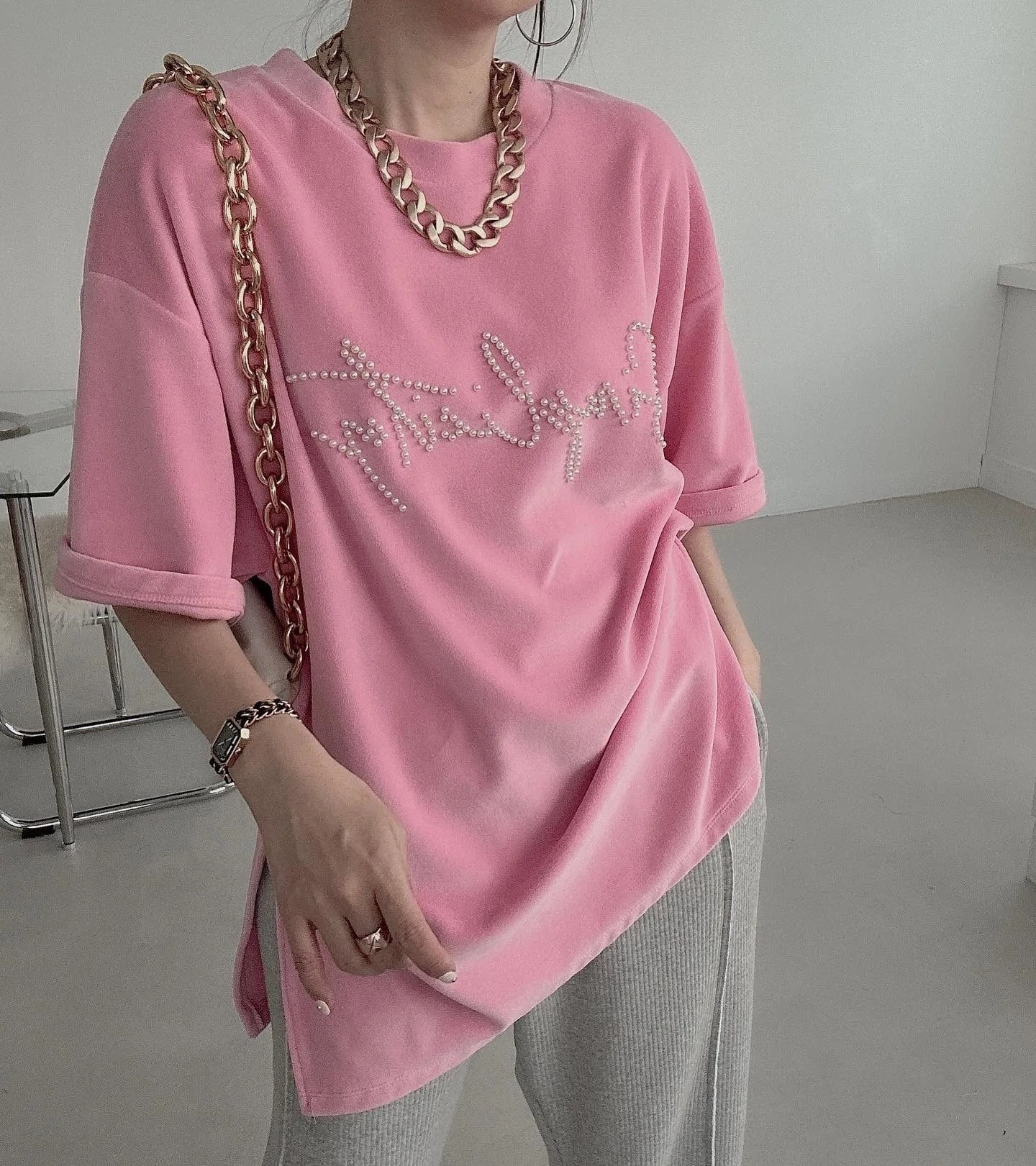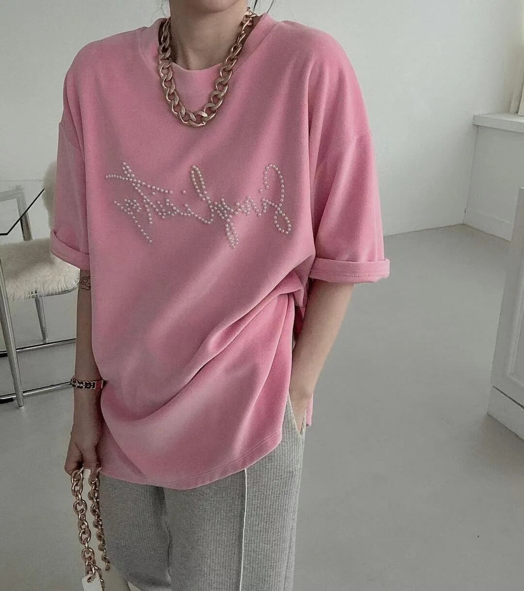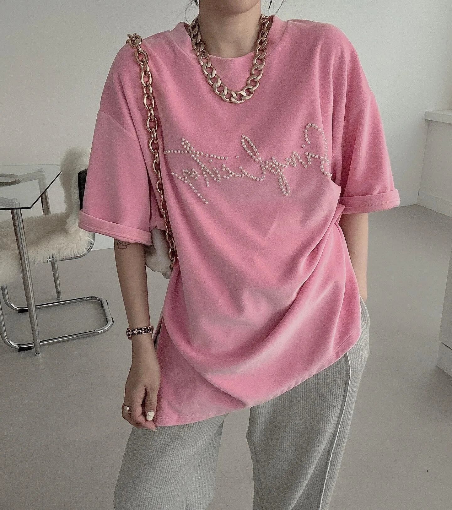 パール ロゴ 半袖 Tシャツ ピンク ベロア調 刺繍 韓国 ストリート Y2K バレエコア ダンス 衣装 K-POP トップス レディース 10T-24
