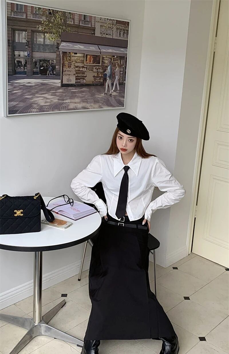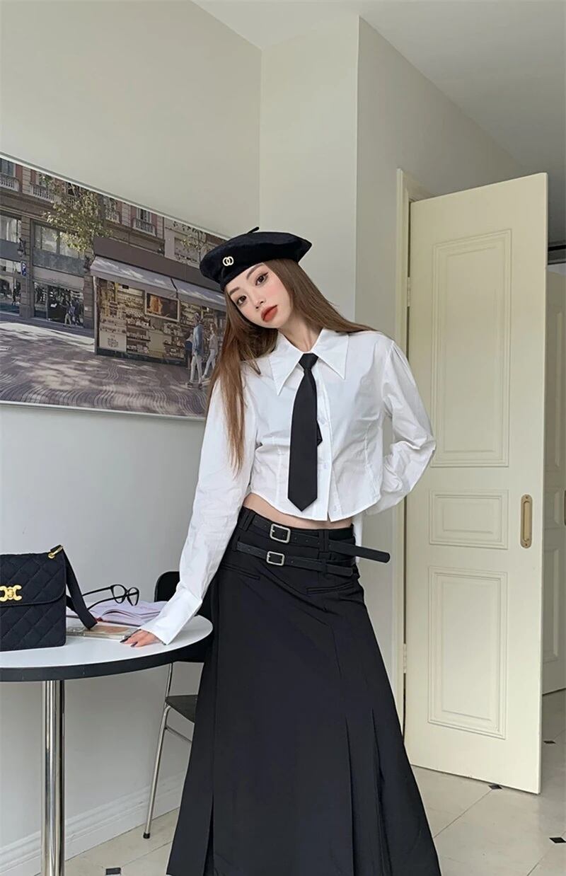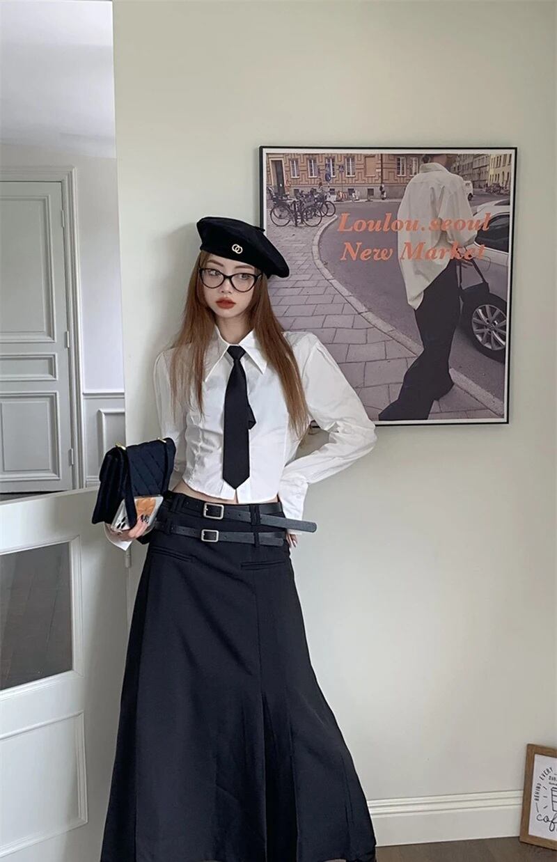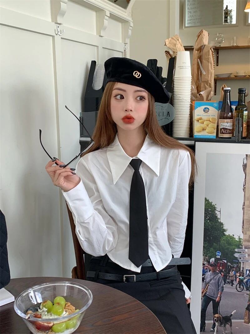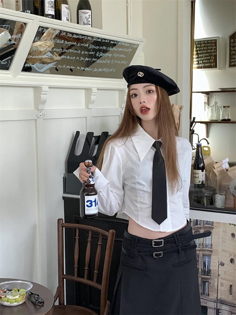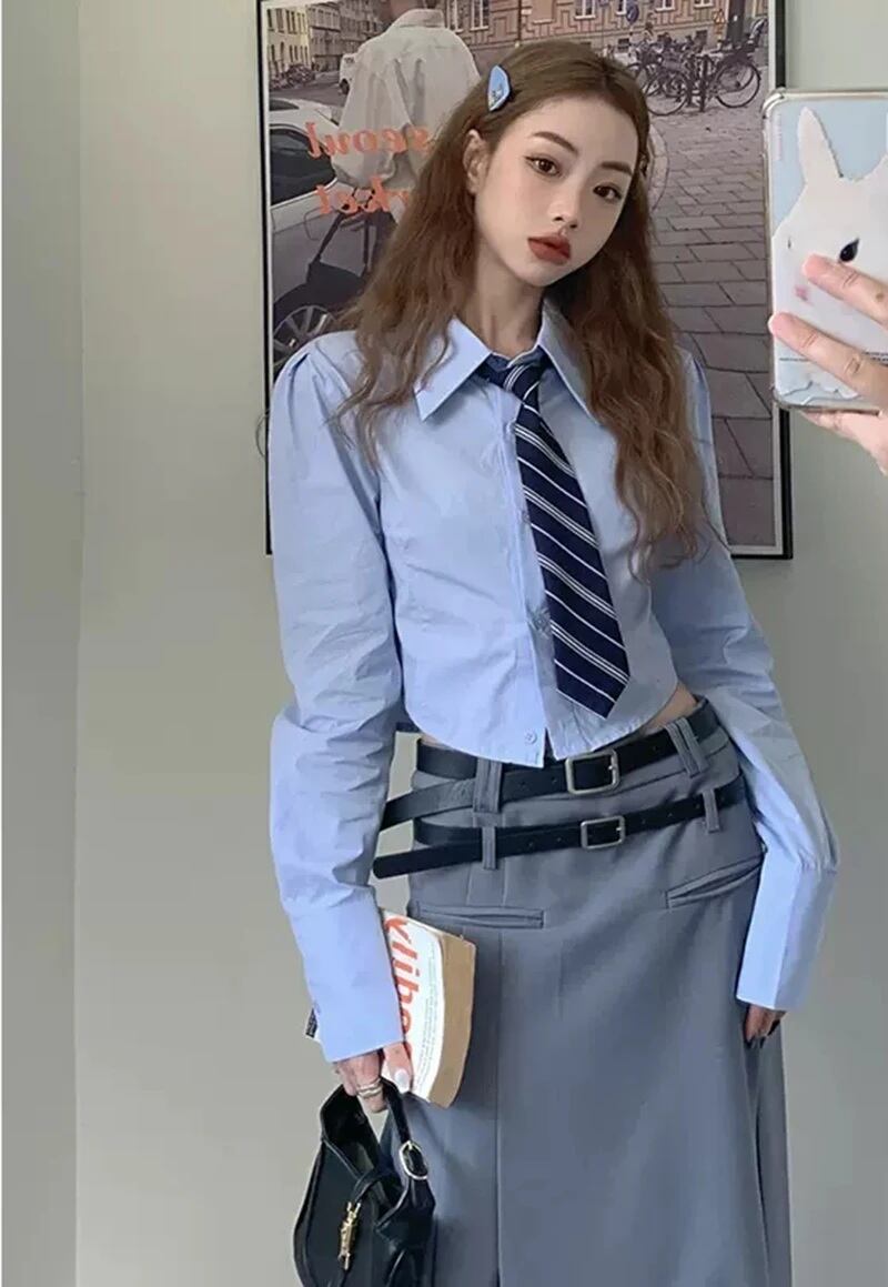 付属のネクタイは取り外し可能なので、その日の気分に合わせて着回し自在。画像のようにプリーツスカートやベルト付きのボトムスと合わせれば、感度の高い韓国ストリートコーデが即完成します。