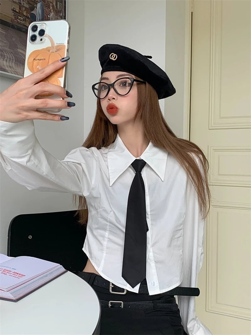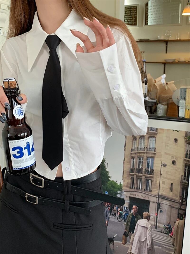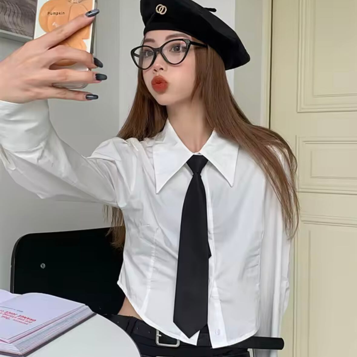 ショート丈 クロップド シャツ 長袖 ネクタイ付き 韓国 ストリート モード系 白 プレッピー 制服 スクールガール風 トップス レディース 10T-25