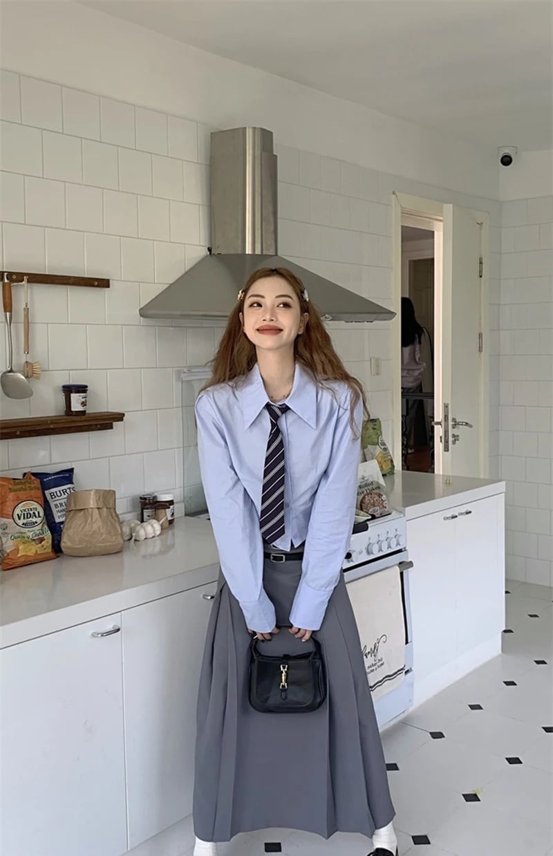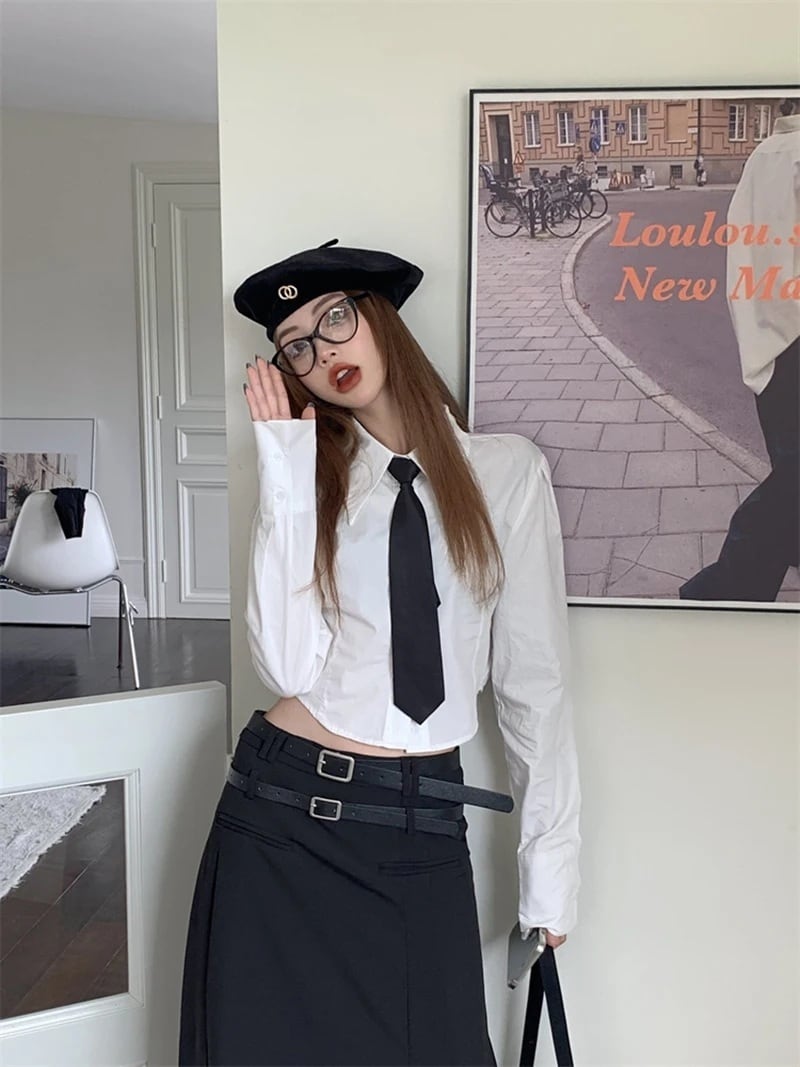 付属のネクタイは取り外し可能なので、その日の気分に合わせて着回し自在。画像のようにプリーツスカートやベルト付きのボトムスと合わせれば、感度の高い韓国ストリートコーデが即完成します。