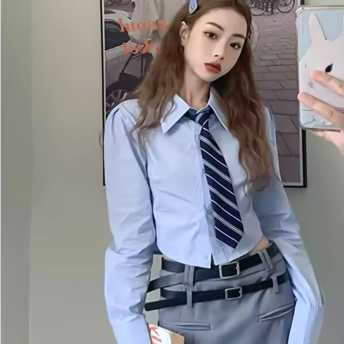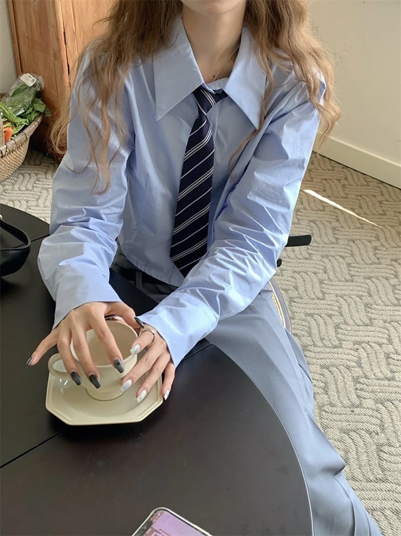 ショート丈 クロップド シャツ 長袖 ネクタイ付き 韓国 ストリート モード系 青 ブルー プレッピー 制服 スクールガール風 トップス レディース 10T-25