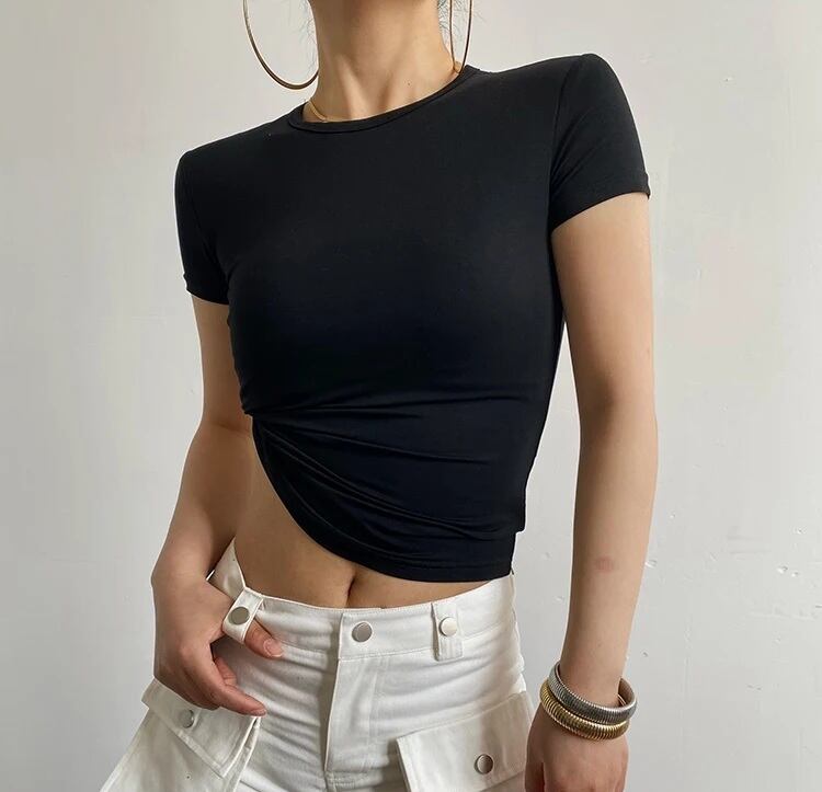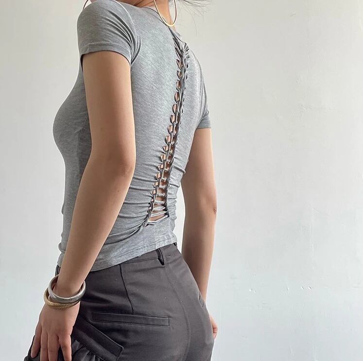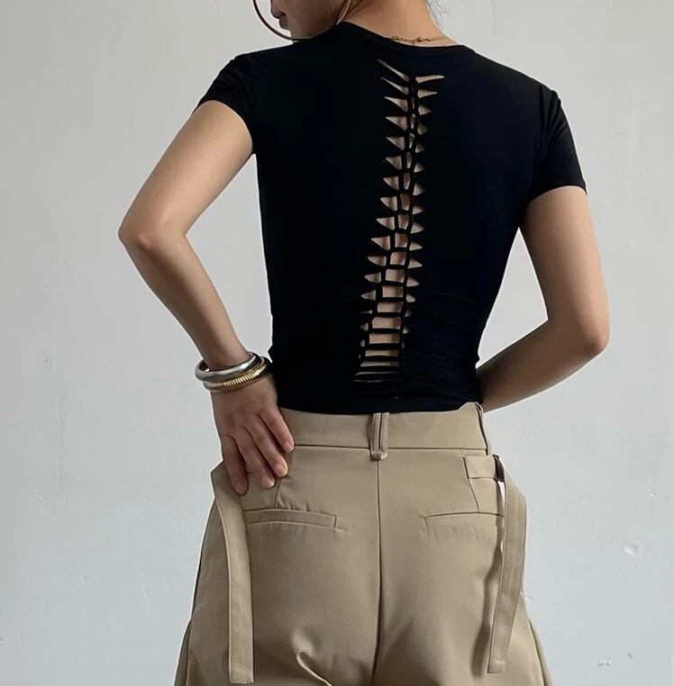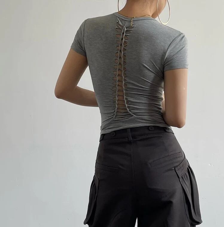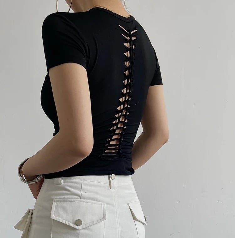 背中あき バックオープン バックシャン 半袖 Tシャツ ギャザー シャーリング タイト 編み上げ 韓国 ストリート モード系 レディース 10T-31