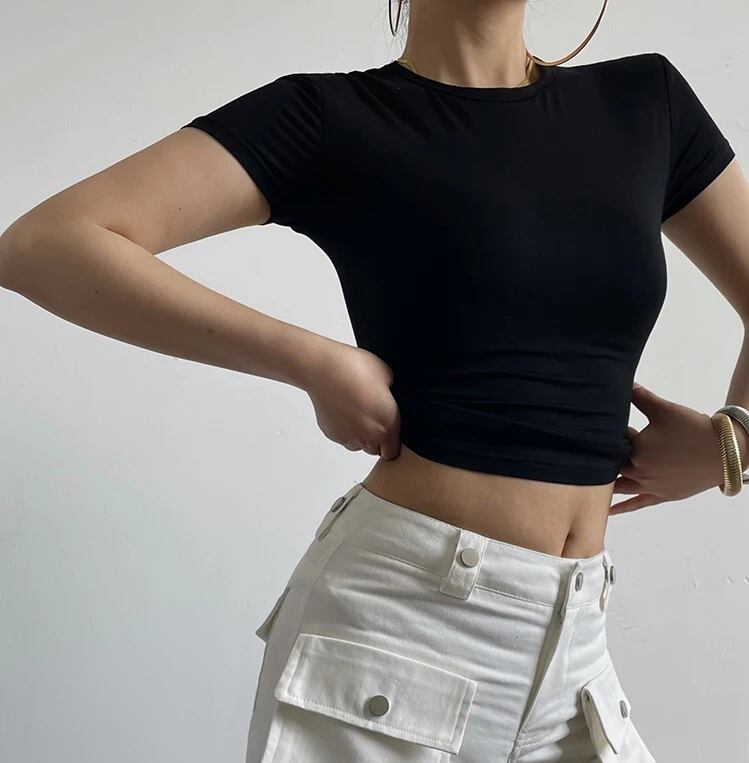 タイトなシルエットで体のラインを美しく見せつつ、ストレッチの効いた素材で着心地も抜群。デニムと合わせてカジュアルに、カーゴパンツと合わせてストリート風に、幅広いスタイリングが楽しめます。
